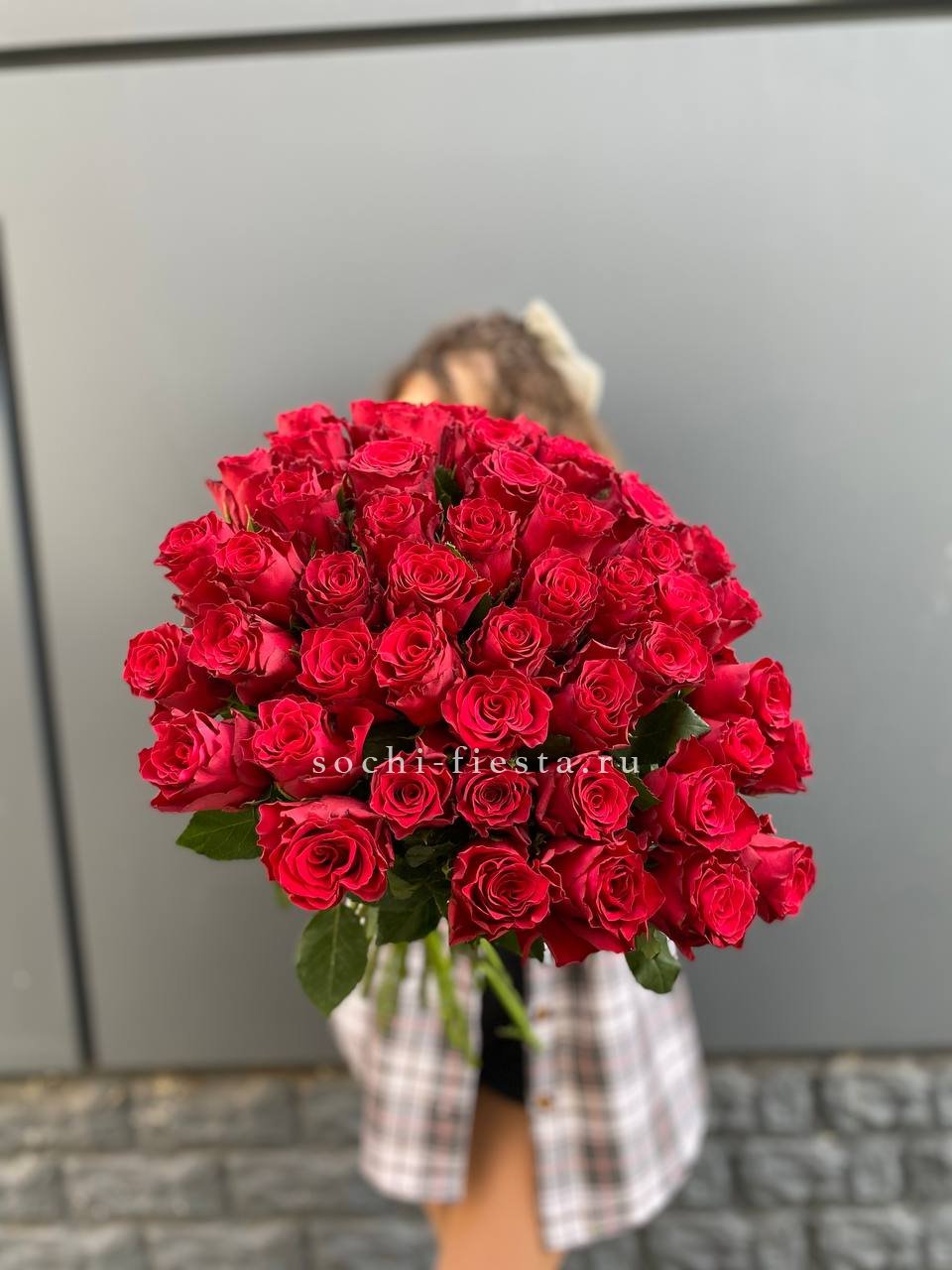 Сто одна роза Madam Red образует объёмное цветовое пятно с глубоким красным оттенком. Букет занимает пространство и сразу притягивает внимание своей насыщенностью.