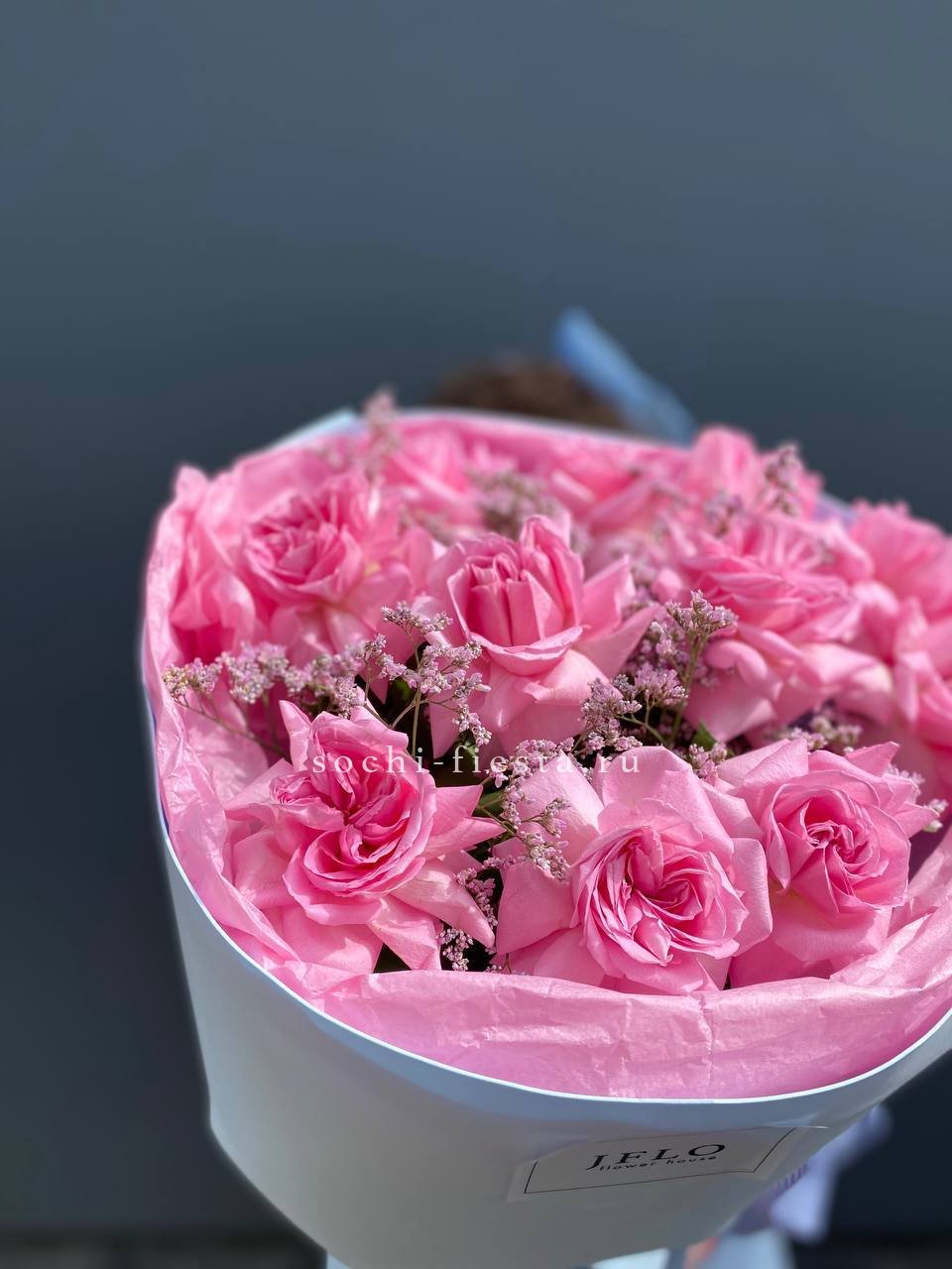французские розовые розы., лимониум, эвкалипт, лента, дизайнерская пленка. На фото представлен букет из 11 роз.