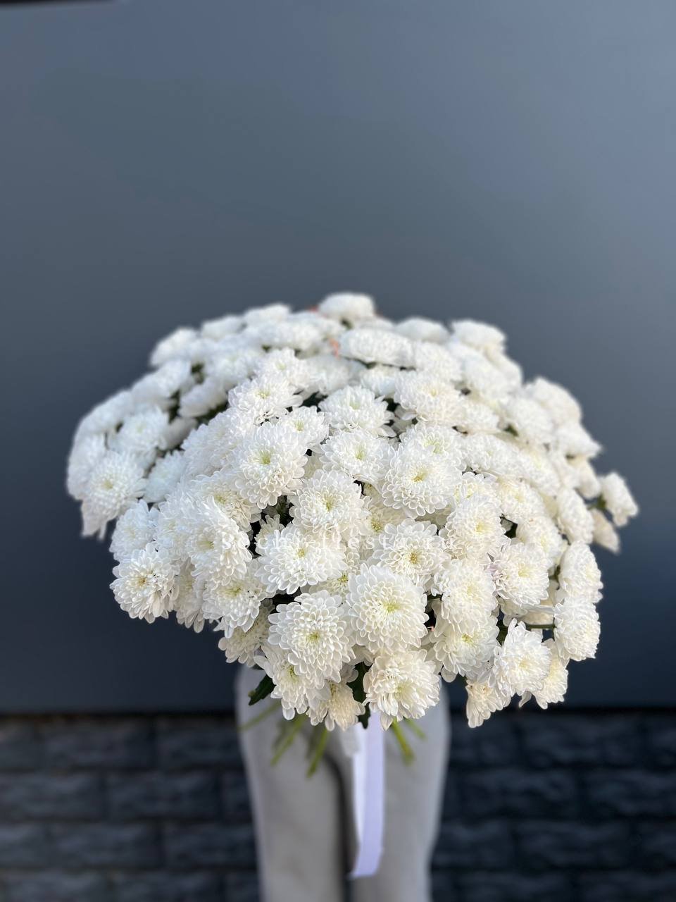 Белоснежные шапки кустовой хризантемы собраны в пышный монобукет, который наполняет пространство свежестью и создает праздничное настроение на любом событии.