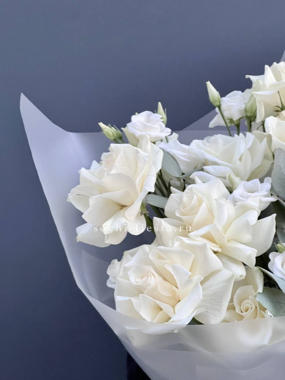 Пятьдесят один бутон в лаконичной упаковке из тишью и плёнки. Белые розы образуют плотный купол, где каждый цветок находит своё место в общей структуре букета.