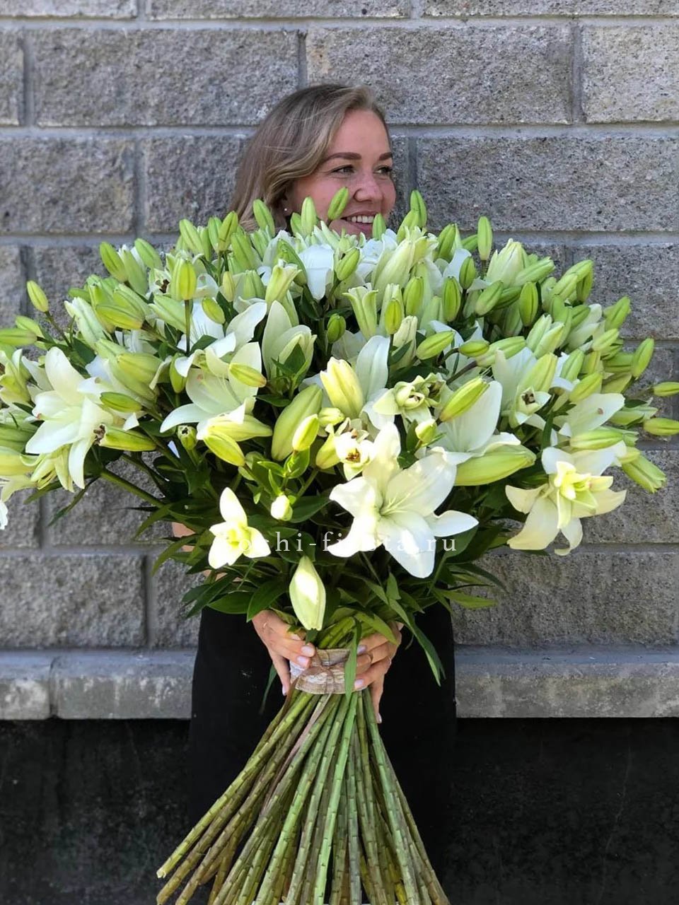 Пятьдесят один бутон лилий собраны в объёмную композицию с выразительным силуэтом. Крупные соцветия создают впечатляющее присутствие и заполняют пространство живым цветом.