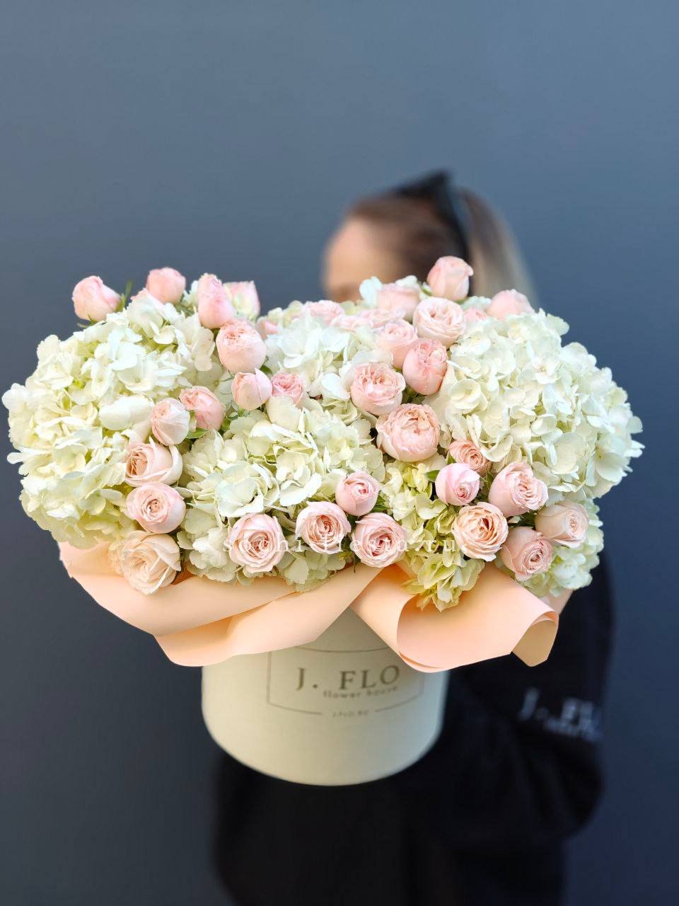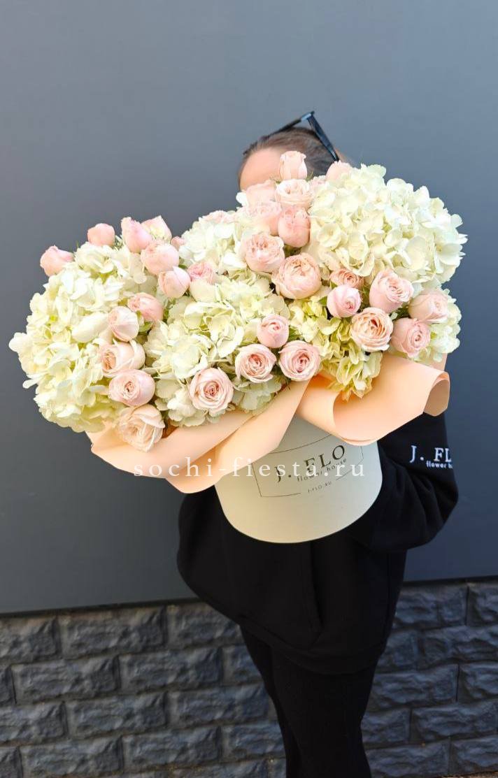 Гортензия и пионовидные розы создают густую округлую форму с мягкими переходами оттенков. Диантус добавляет воздушные вкрапления между крупными бутонами. Композиция в сумке-кашпо держит силуэт и выглядит цельно.