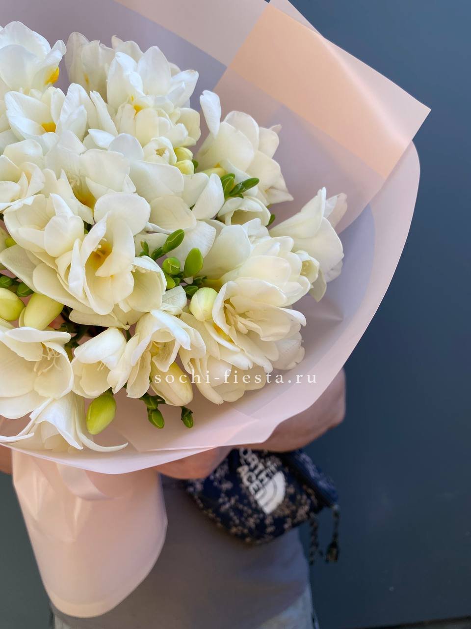 Состав: 25 белых фрезий, оформление, лента