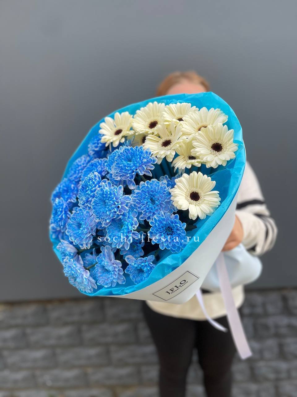 Яркие герберы и пышные хризантемы собраны в жизнерадостную композицию. Букет держит форму и долго радует свежестью, удобно размещается в любой вазе и не требует сложного ухода.