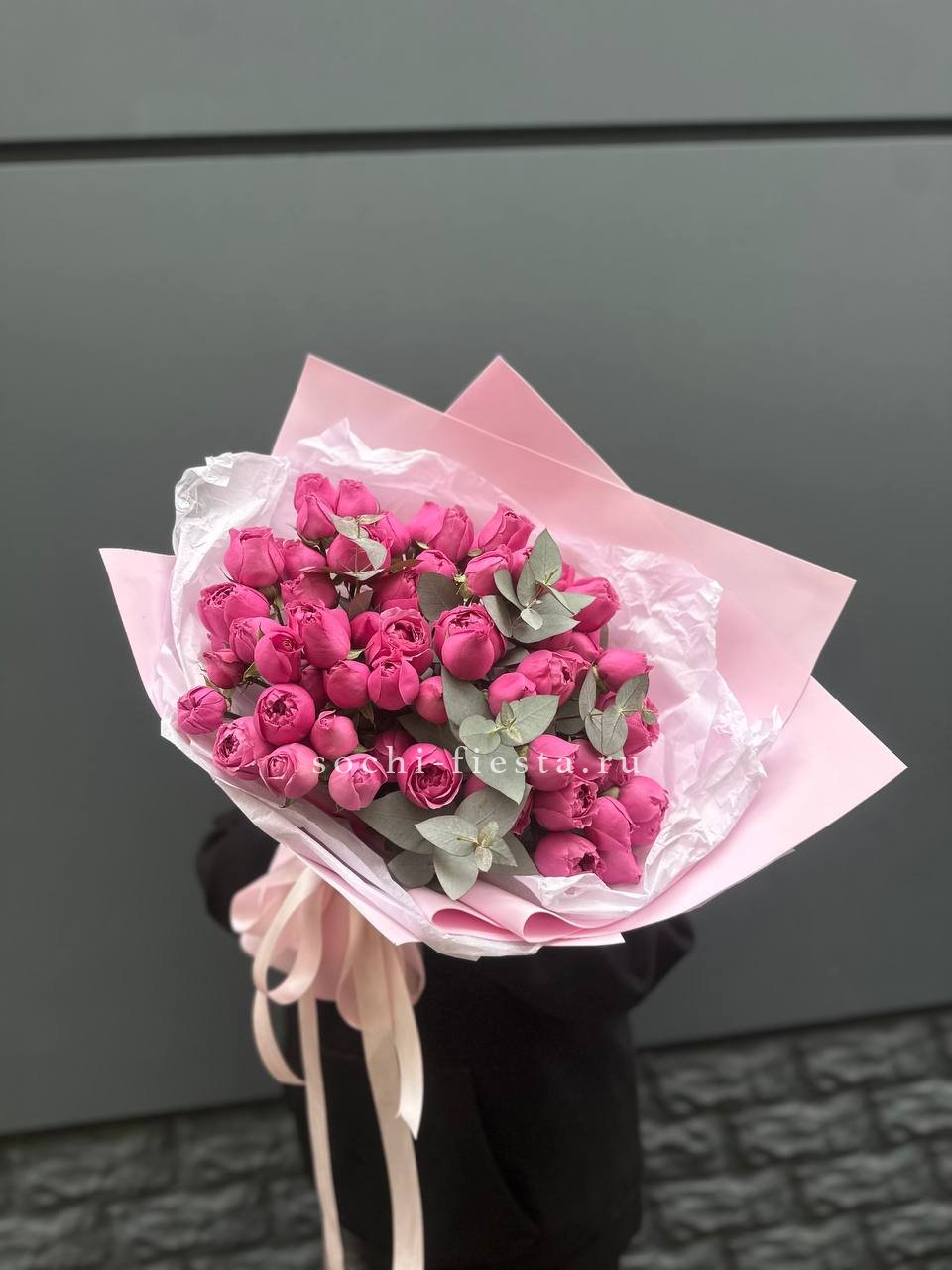 кустовые розы, эустома, хлопок, лента и дизайнерская пленка.