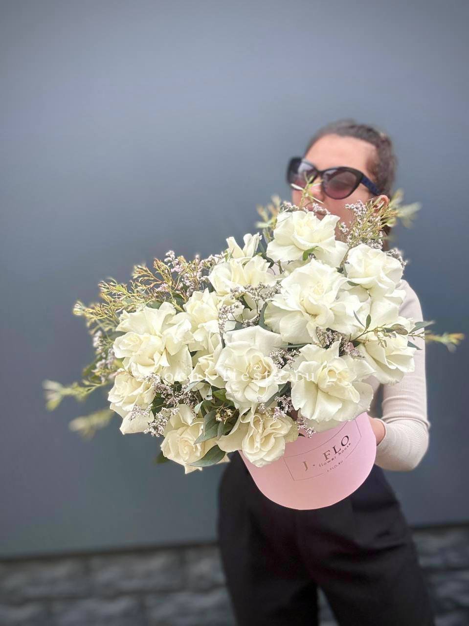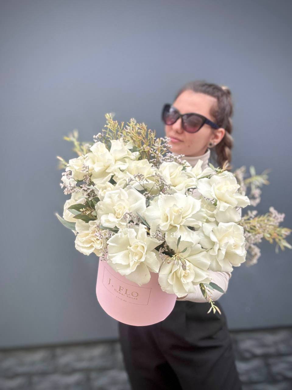 Розовые розы соседствуют с воздушной эустомой и яркими диантусами. Лимониум добавляет дымчатые нюансы, а озатамус вносит графичные детали в общую палитру.