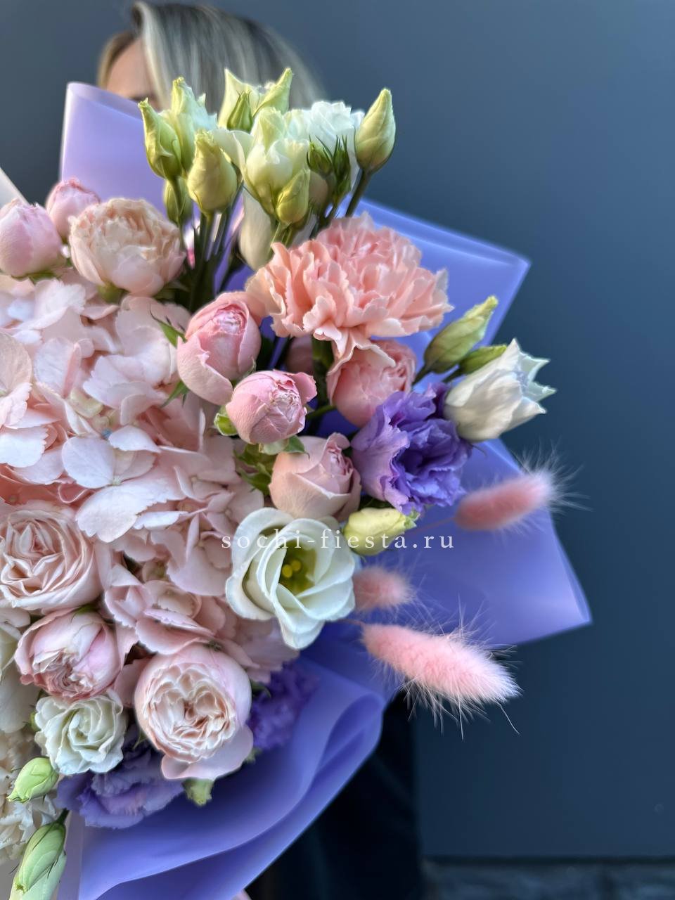 Пышные головки гортензии задают объём, а вывернутые розы добавляют воздушности всей форме. Лиловые оттенки переплетаются с нежной зеленью, создавая мягкий переход от насыщенного к светлому.