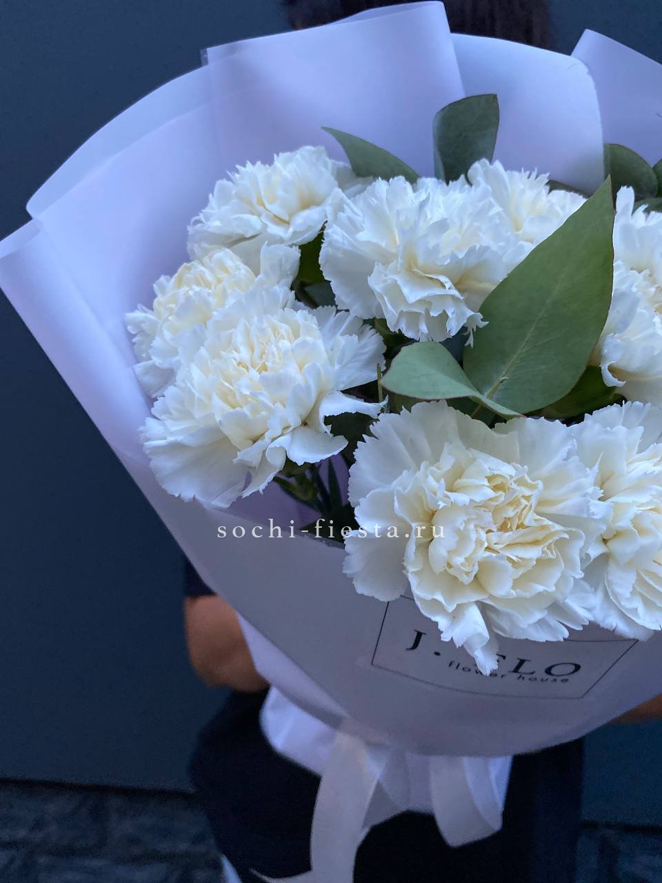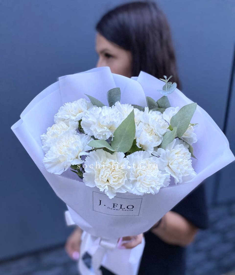 Букет из пятнадцати белых диантусов вписывается в любое пространство благодаря компактной форме. Цветы долго сохраняют свежесть и не требуют сложного ухода.