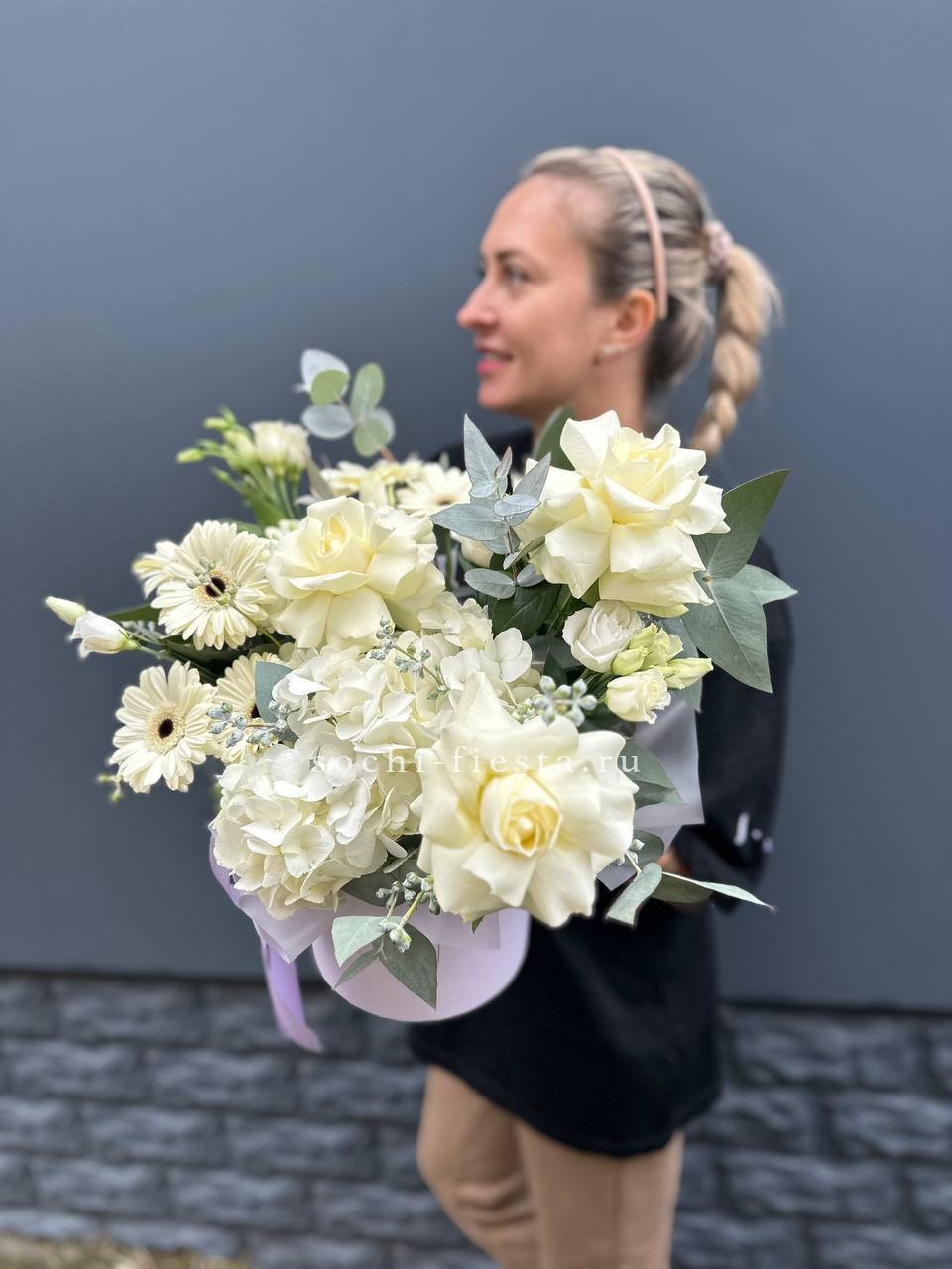 гортензия, герберы, розы французские, эустомы, эвкалипт, оазис, шляпная коробка, пленка, лента.