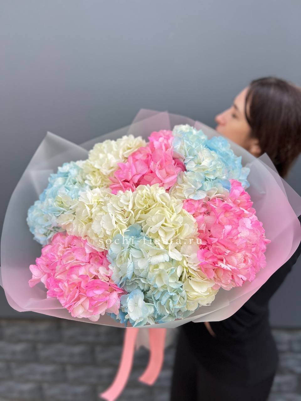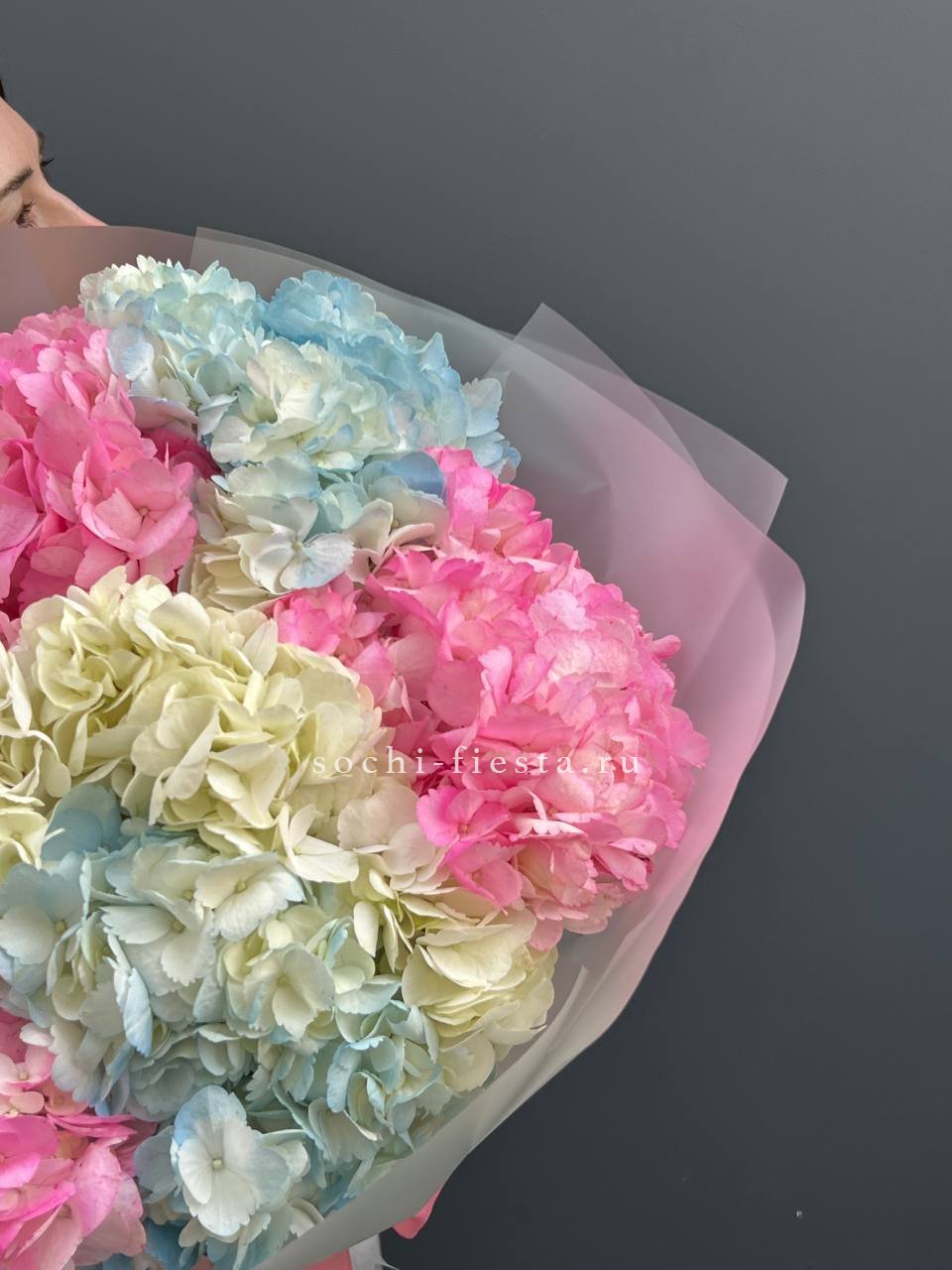 Пышные шапки розовой гортензии собраны в объёмную охапку, где каждое соцветие создаёт мягкую фактурную волну. Оттенок варьируется от пудрового до насыщенного ягодного, формируя живописную глубину.