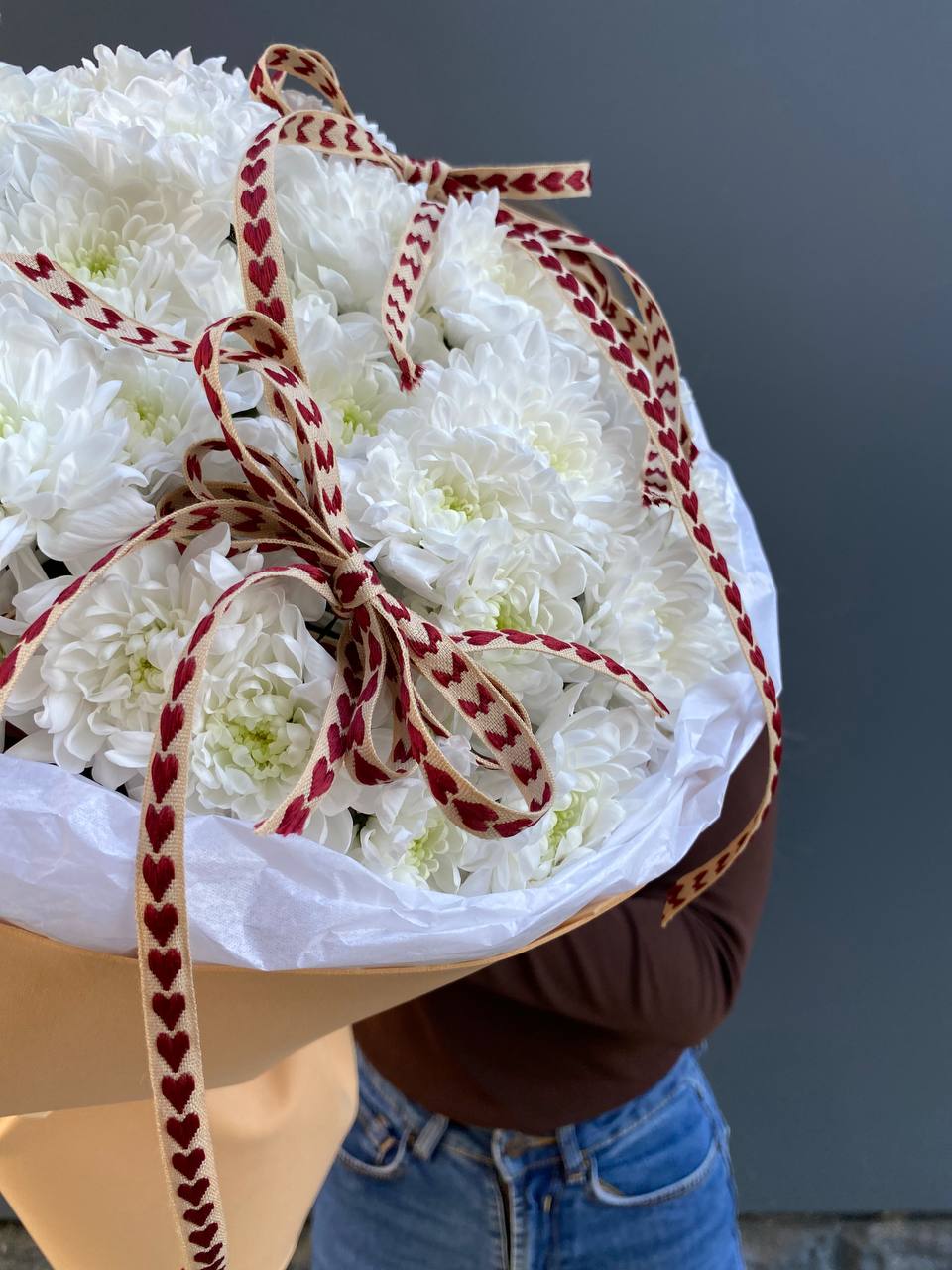 Одиннадцать крупных хризантем Cassiopeia собраны в плотный букет с выразительным объёмом. Каждый бутон раскрыт полностью, создавая насыщенную текстуру и живую игру света на лепестках.
