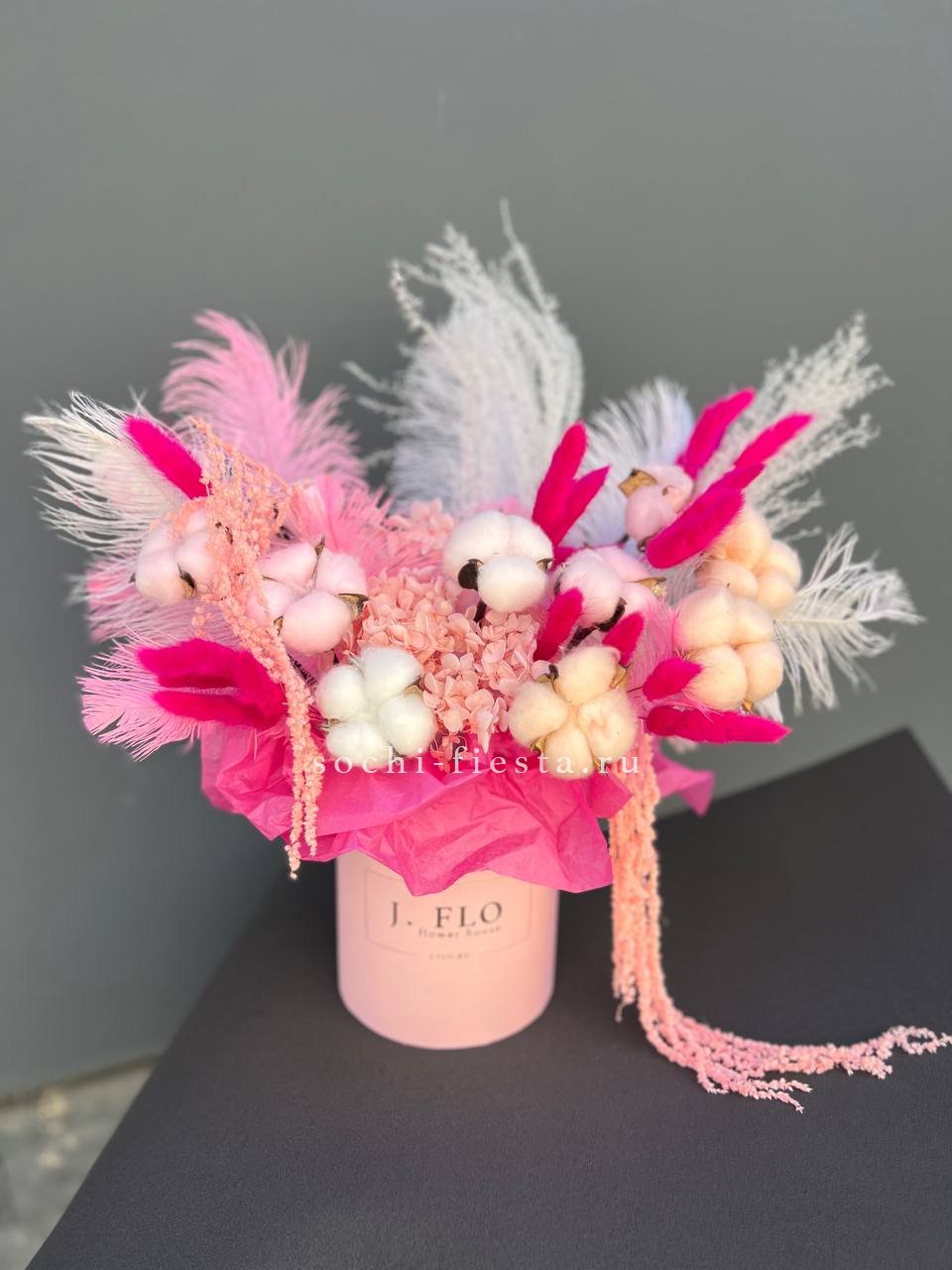 Бокс с природными текстурами: мягкость хлопка, воздушность лагуруса и графичность амаранта. Перья добавляют легкости. Композиция держит форму и не теряет выразительности со временем.