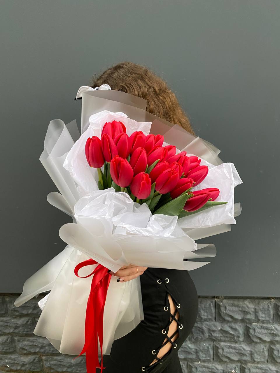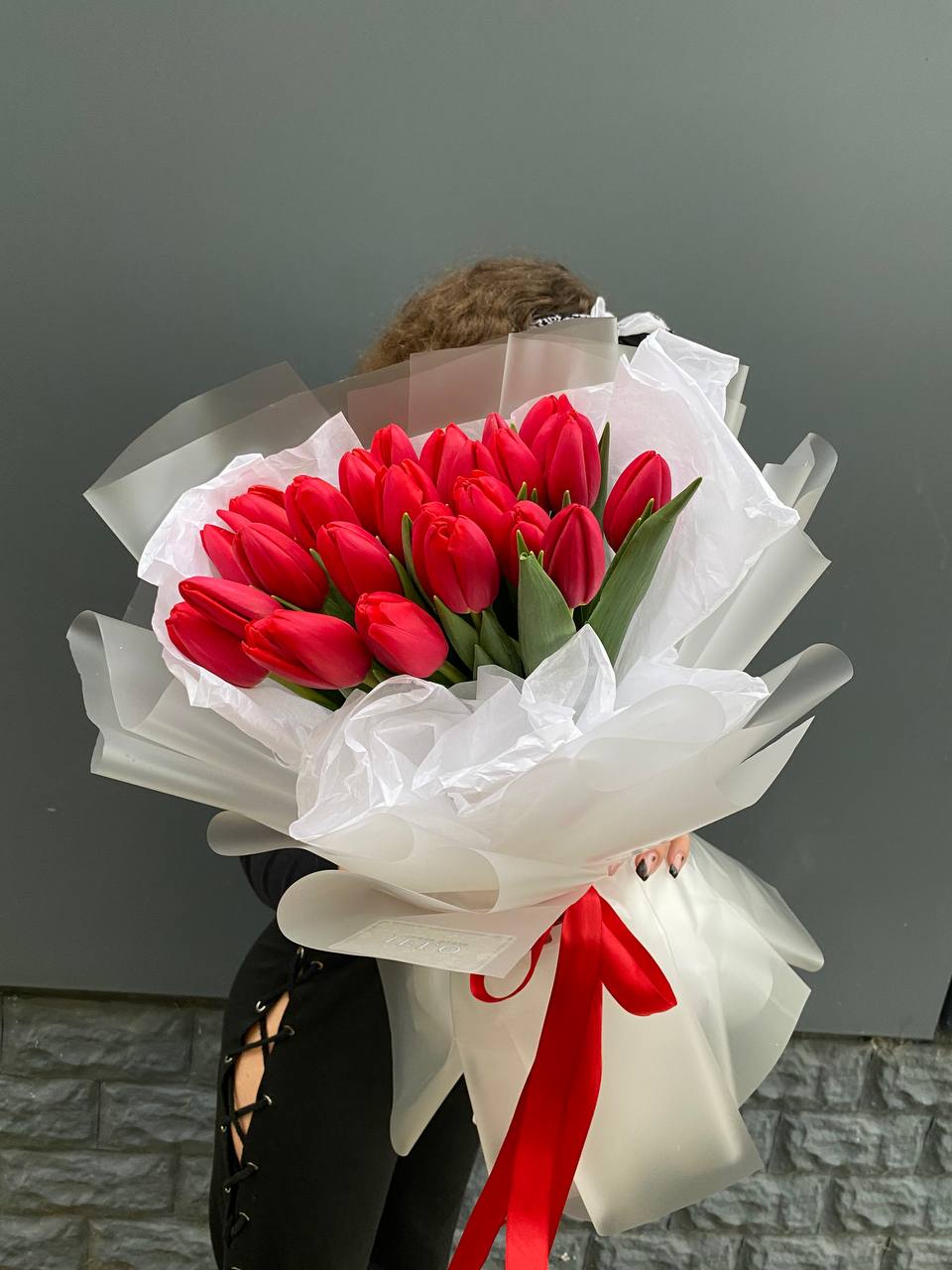 Тридцать семь тюльпанов создают яркое цветовое пятно в любом интерьере. Крафтовая упаковка оставляет композицию открытой и подчёркивает графику стеблей. Букет выглядит свободно и современно.