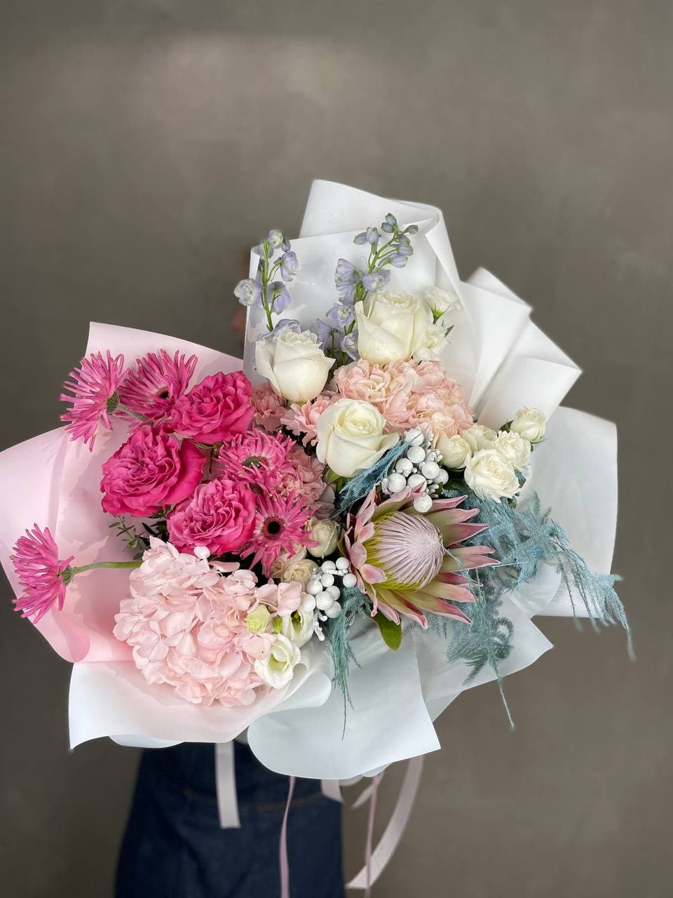 Протея задаёт графичный центр композиции, вокруг которого раскрываются розы и воздушная эустома. Диантус добавляет текстурные пятна, а эвкалипт смягчает линии. Букет с характером и выразительной архитектурой.
