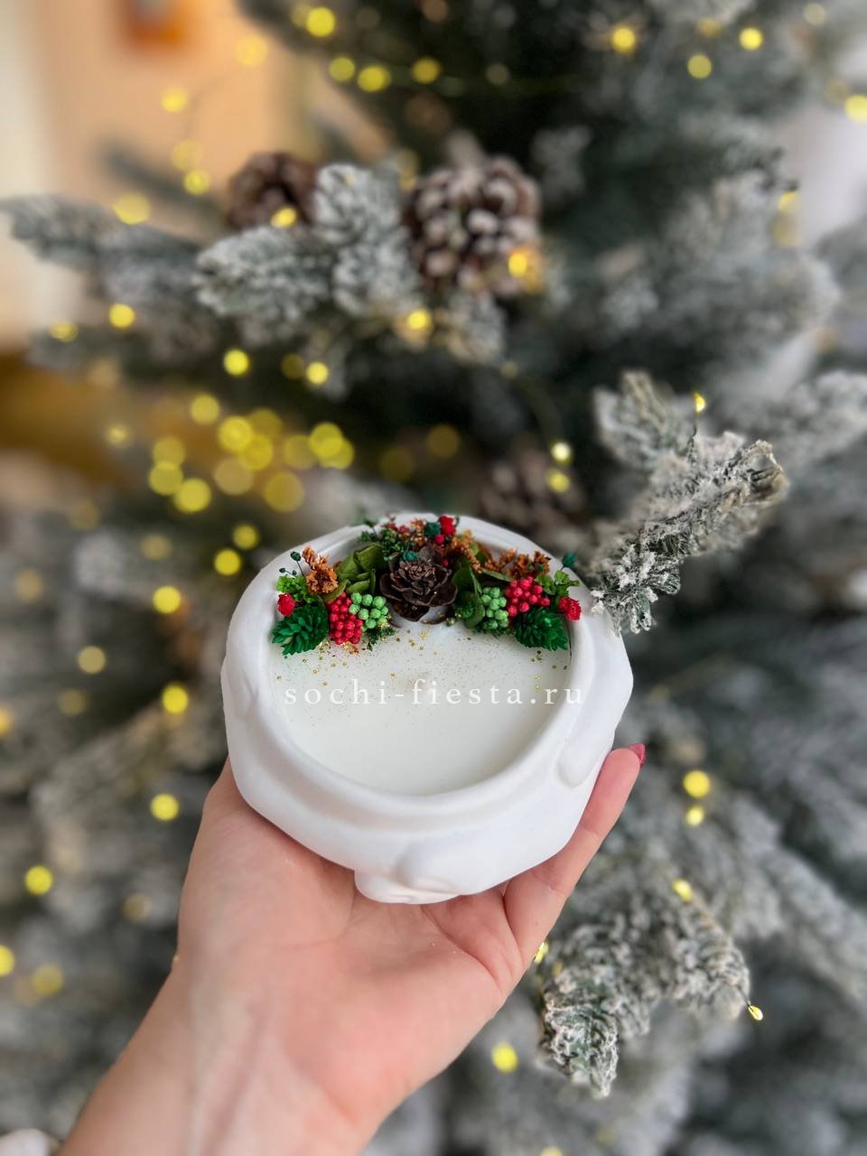 Руки бережно держат шишку — скульптурная форма из гипса с кокосовым воском внутри. Ароматы бузины или мангостина раскрываются мягко и наполняют пространство теплом.