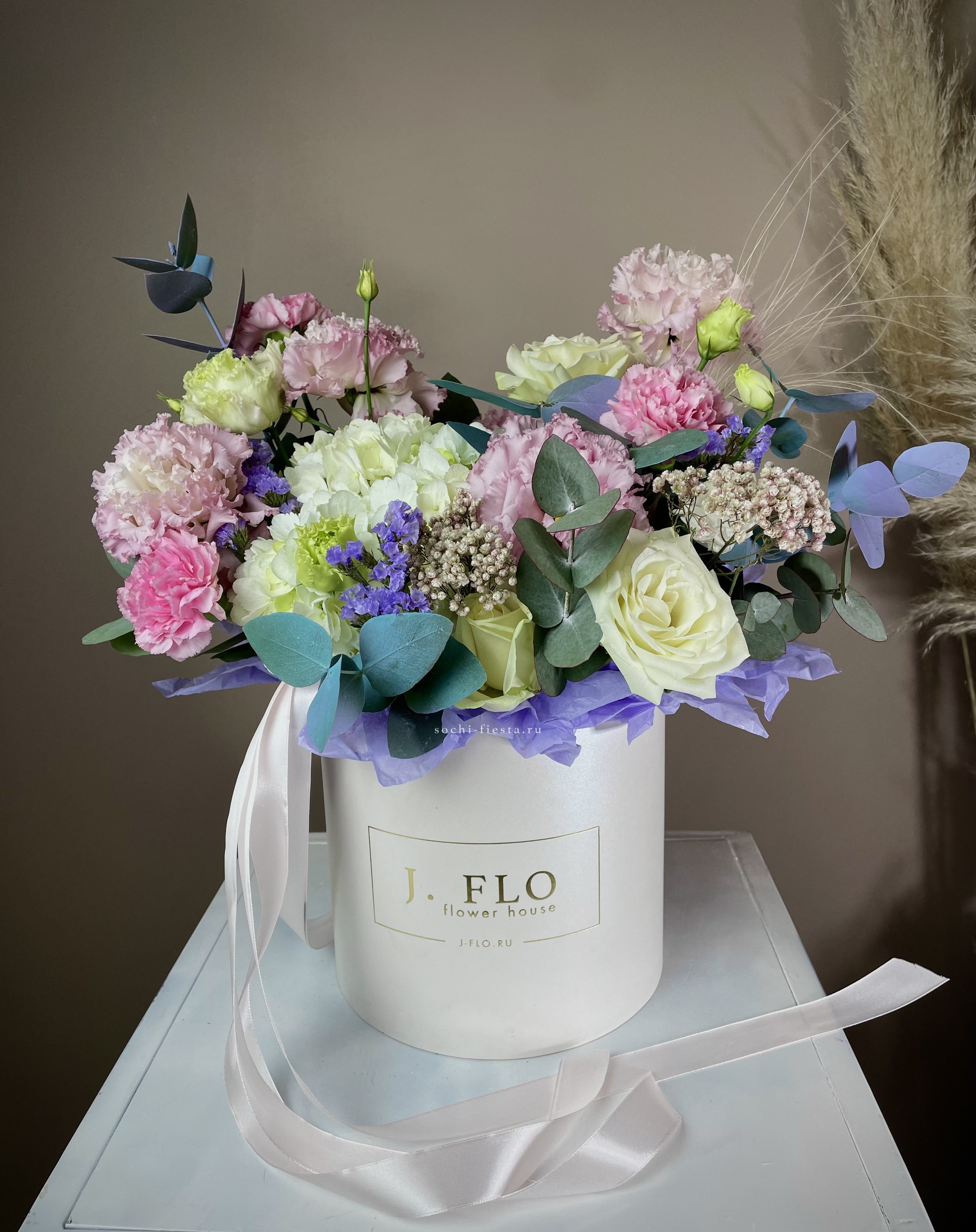 белые розы, эустома, цилиндр D13, эвкалипт, лента, упаковка.