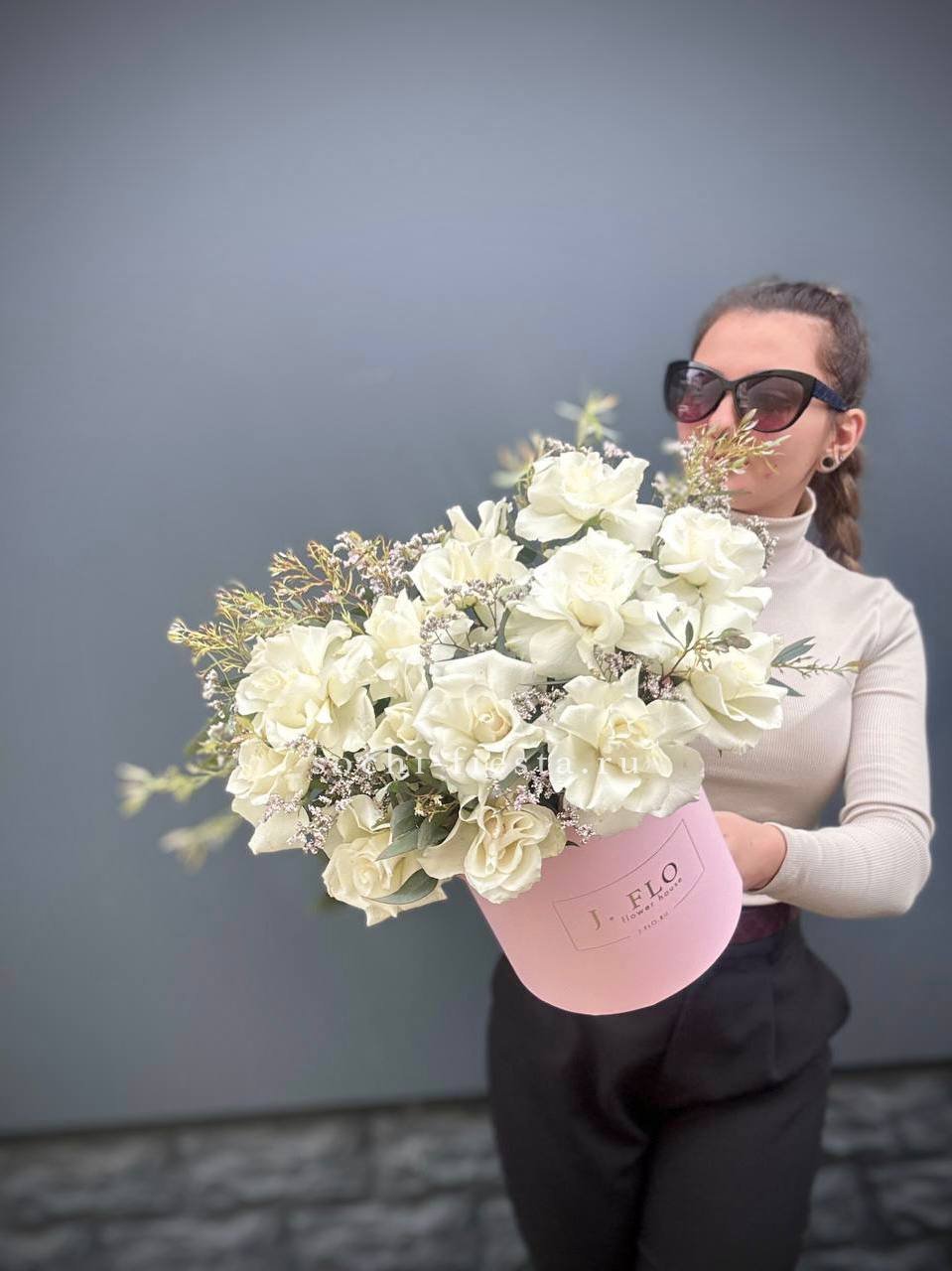 Семнадцать белых роз с раскрытыми лепестками образуют плотную округлую форму в цилиндре. Эвкалипт и лимониум добавляют фактурные переходы между бутонами.