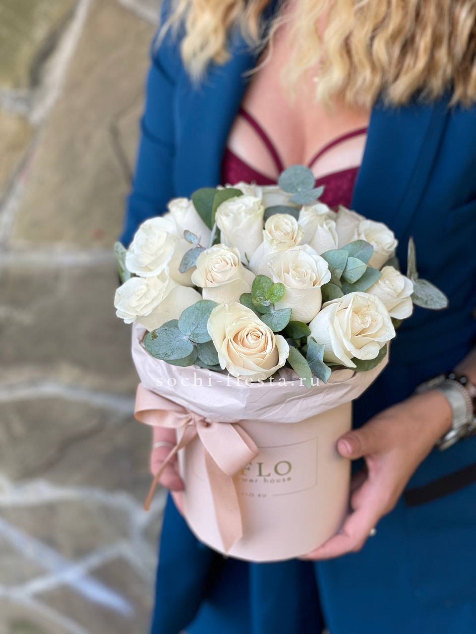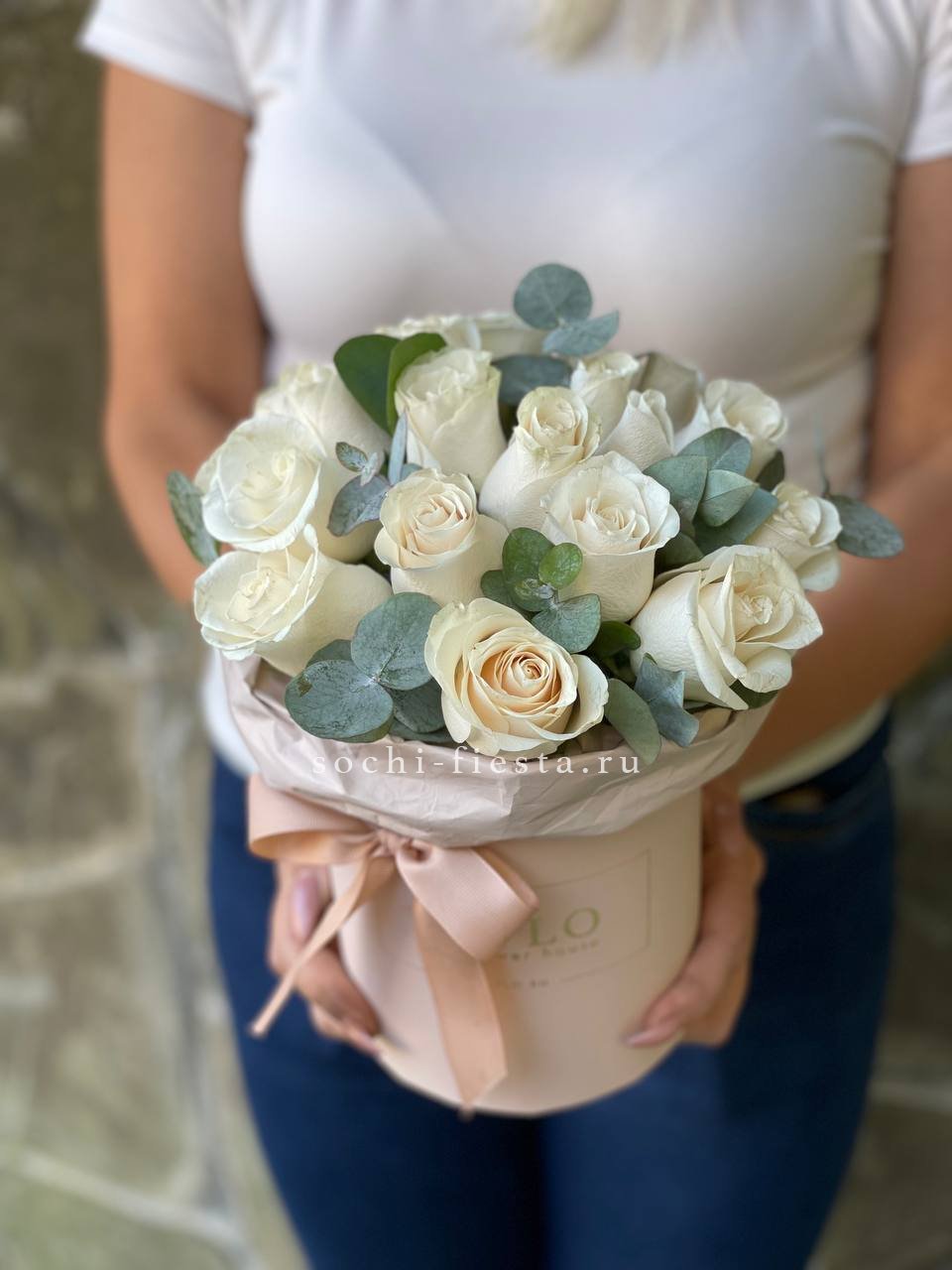 Пышные головки диантуса собраны плотной шапкой в круглой коробке. Ветви эвкалипта создают воздушное обрамление. Минималистичная композиция с выраженной текстурой.