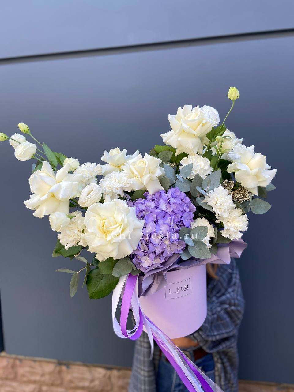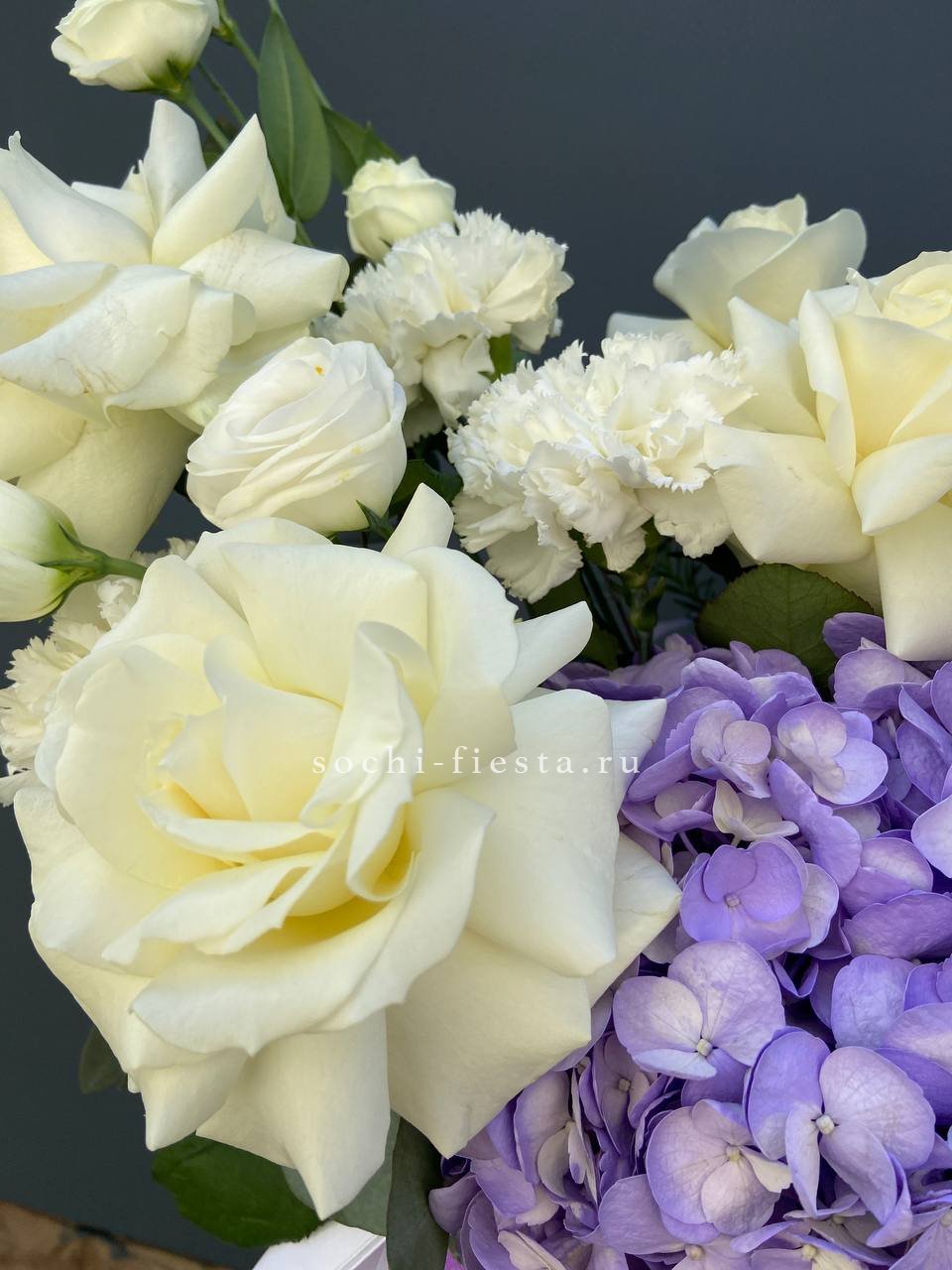 гортензия, французские розы, диантусы, эустома, цилиндр D16, бумага тишью.