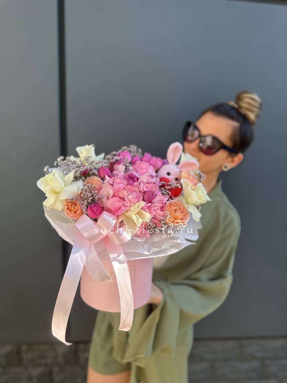 Пышная гортензия сплетается с воздушными кустовыми розами в объёмной шляпной коробке. Мягкие оттенки и многослойная фактура создают ощущение лёгкости и свободы. Композиция занимает пространство уверенно и непринуждённо.
