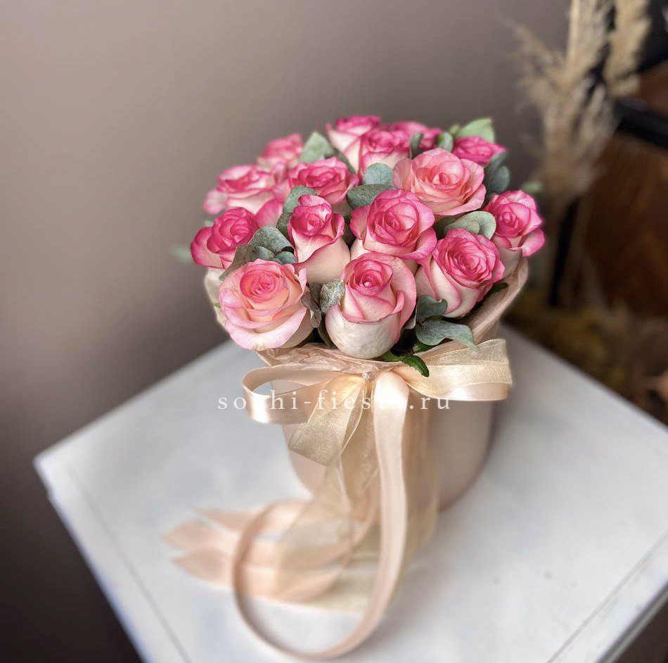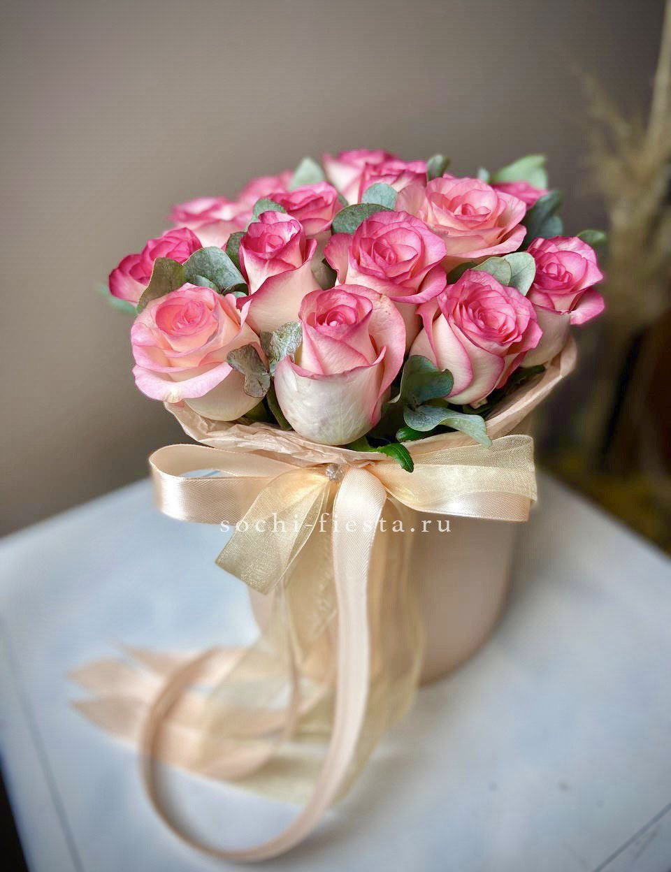 пионовидные кустовые розы 25 шт., эвкалипт, зелень, лента, цилиндр D20.