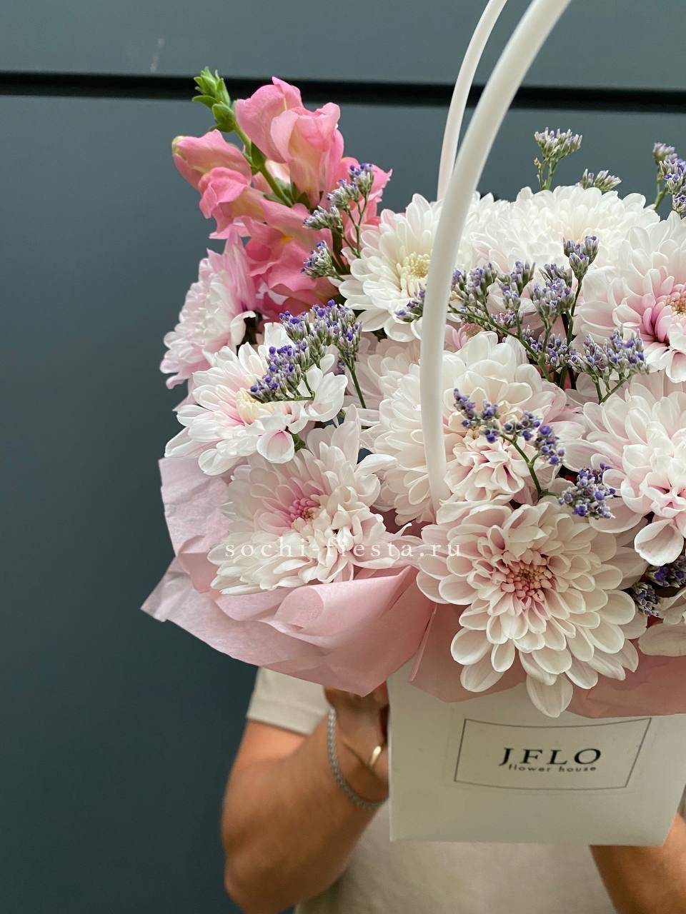 Герберы и маттиола вместе с диантусами выстраивают вертикальный ритм в flower bag. Белая роза и кустовая хризантема добавляют композиции завершенность.