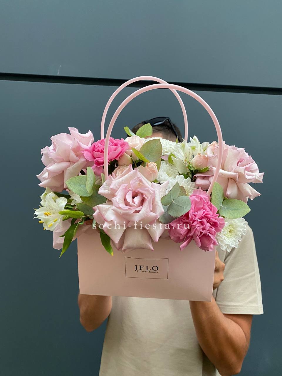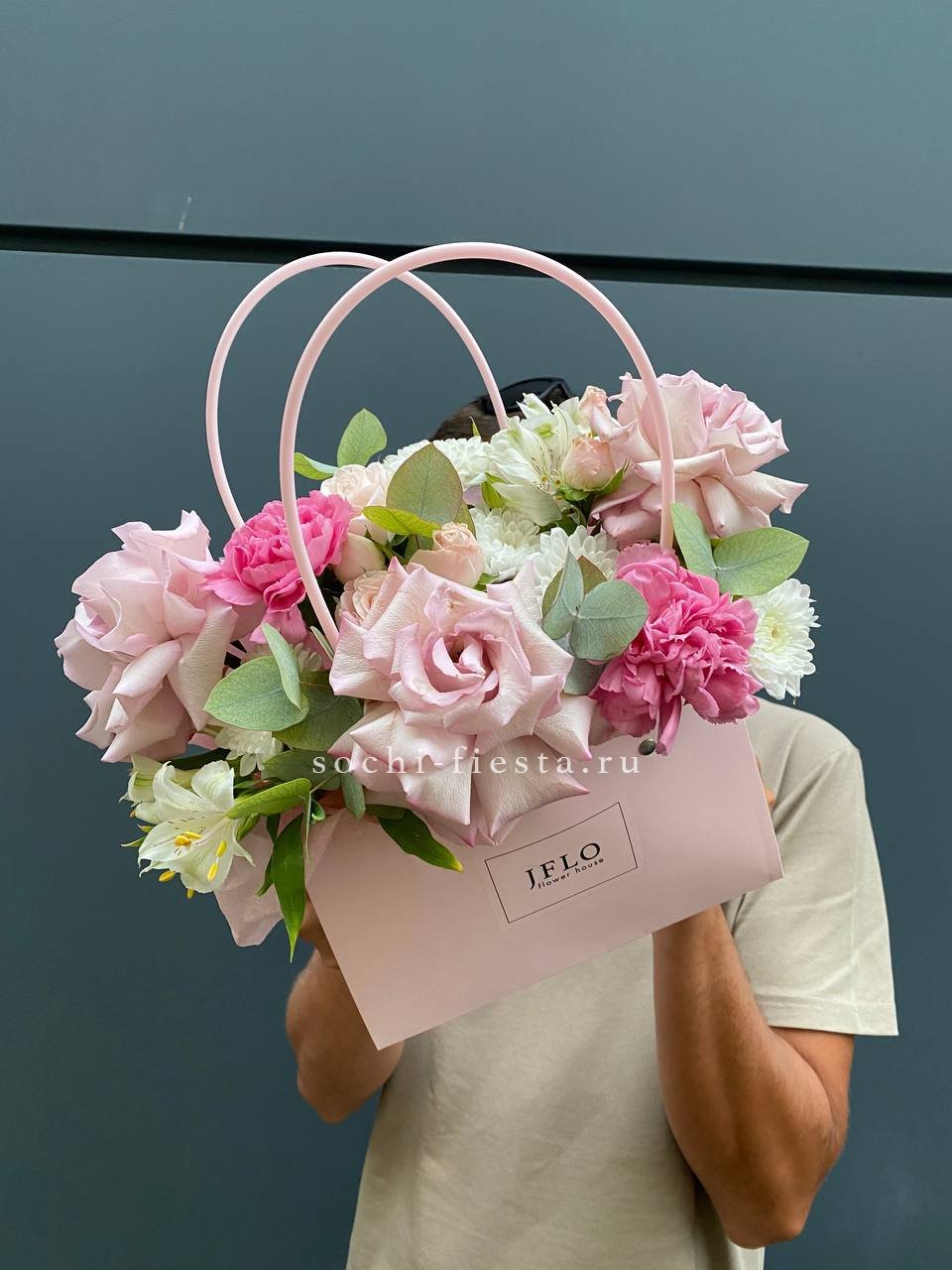 Весенняя композиция в миниатюрной сумочке собрана из хризантем, роз и пушистых веток вербы. Хлопок добавляет мягкости, а эвкалипт освежает общую картину. Компактная форма позволяет разместить её на столе или комоде.