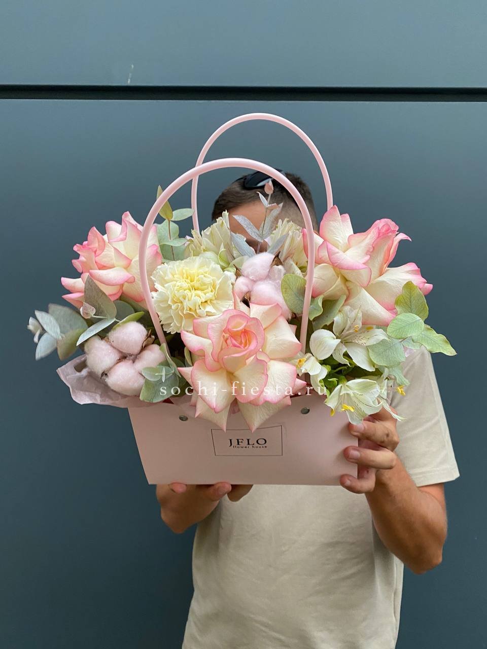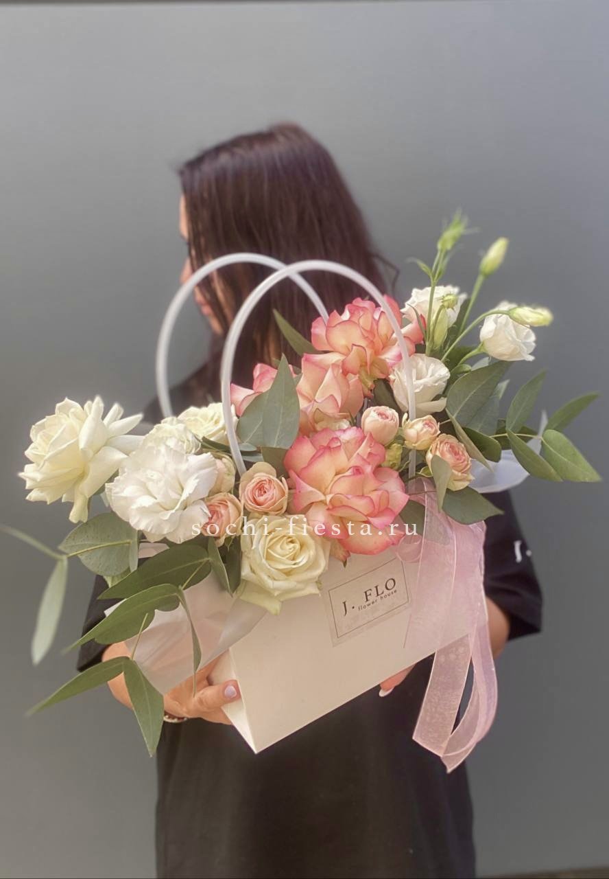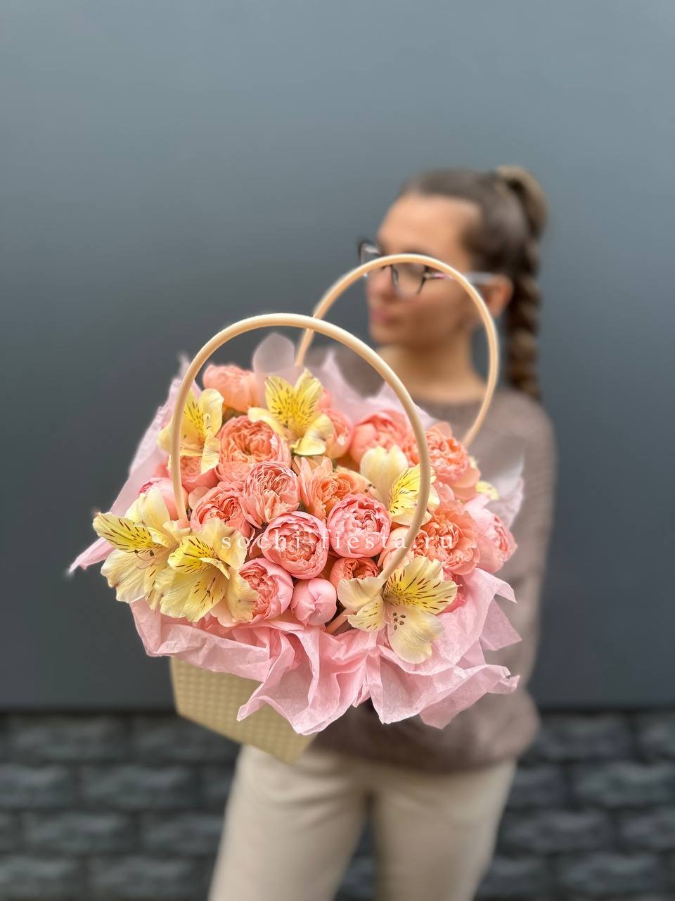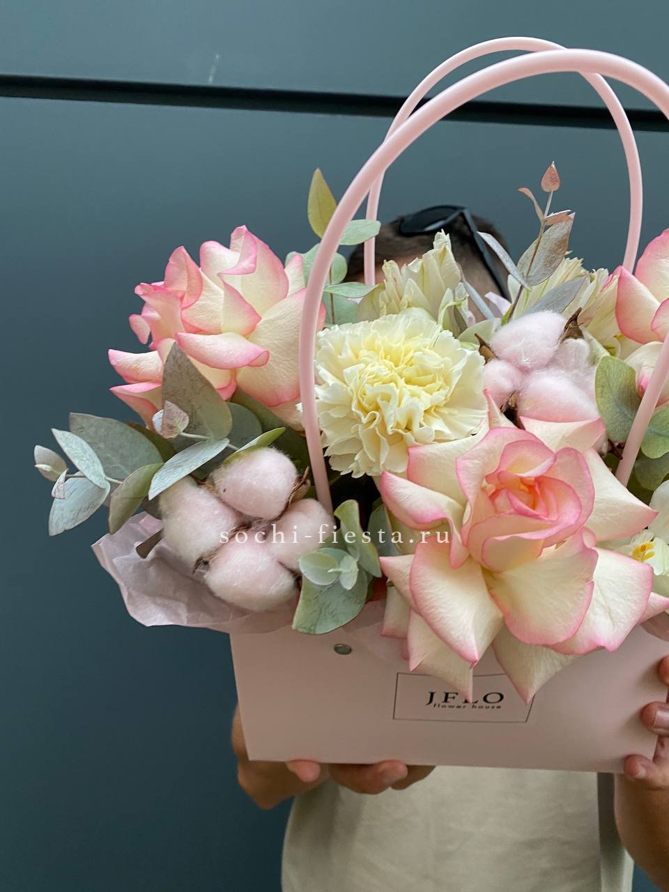 пионовидные кустовые розы, альстромерии, сумочка, лента.