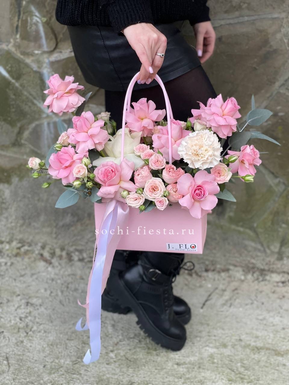 хризантема, маттиола, гербера, бомбастик, эустома, сумочка.