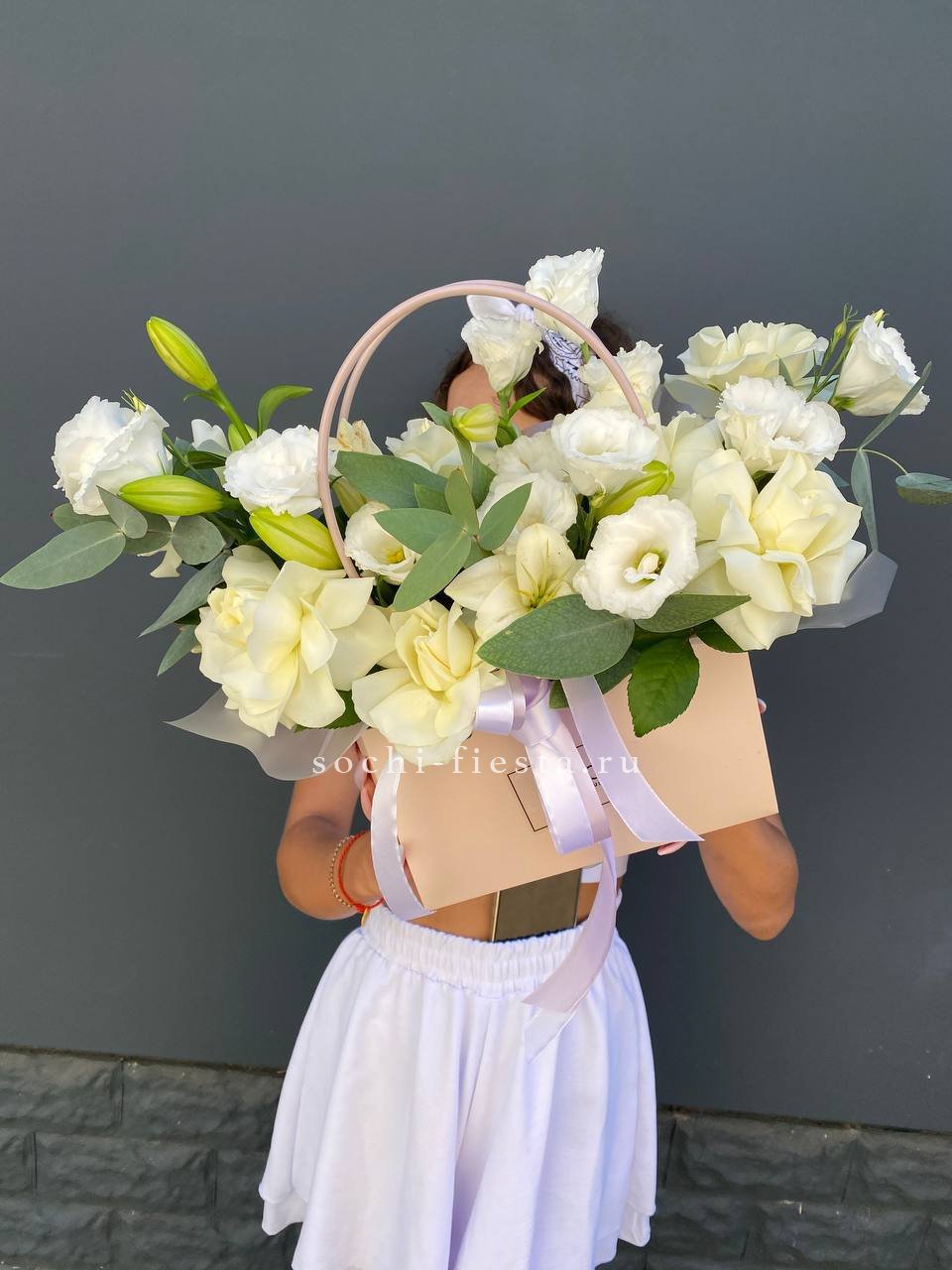 эустома, французские розы, эвкалипт, лилия, сумочка, оазис.