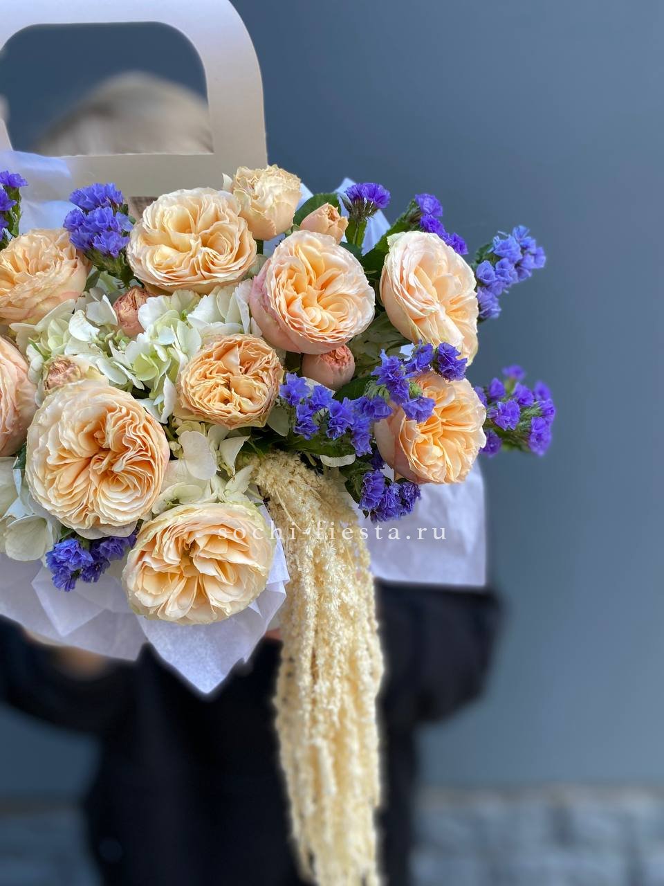 Голубая гортензия и статица задают основной тон, а кустовые розы разбавляют прохладную палитру теплыми нотами. Сумочка держит форму и выглядит собранно.