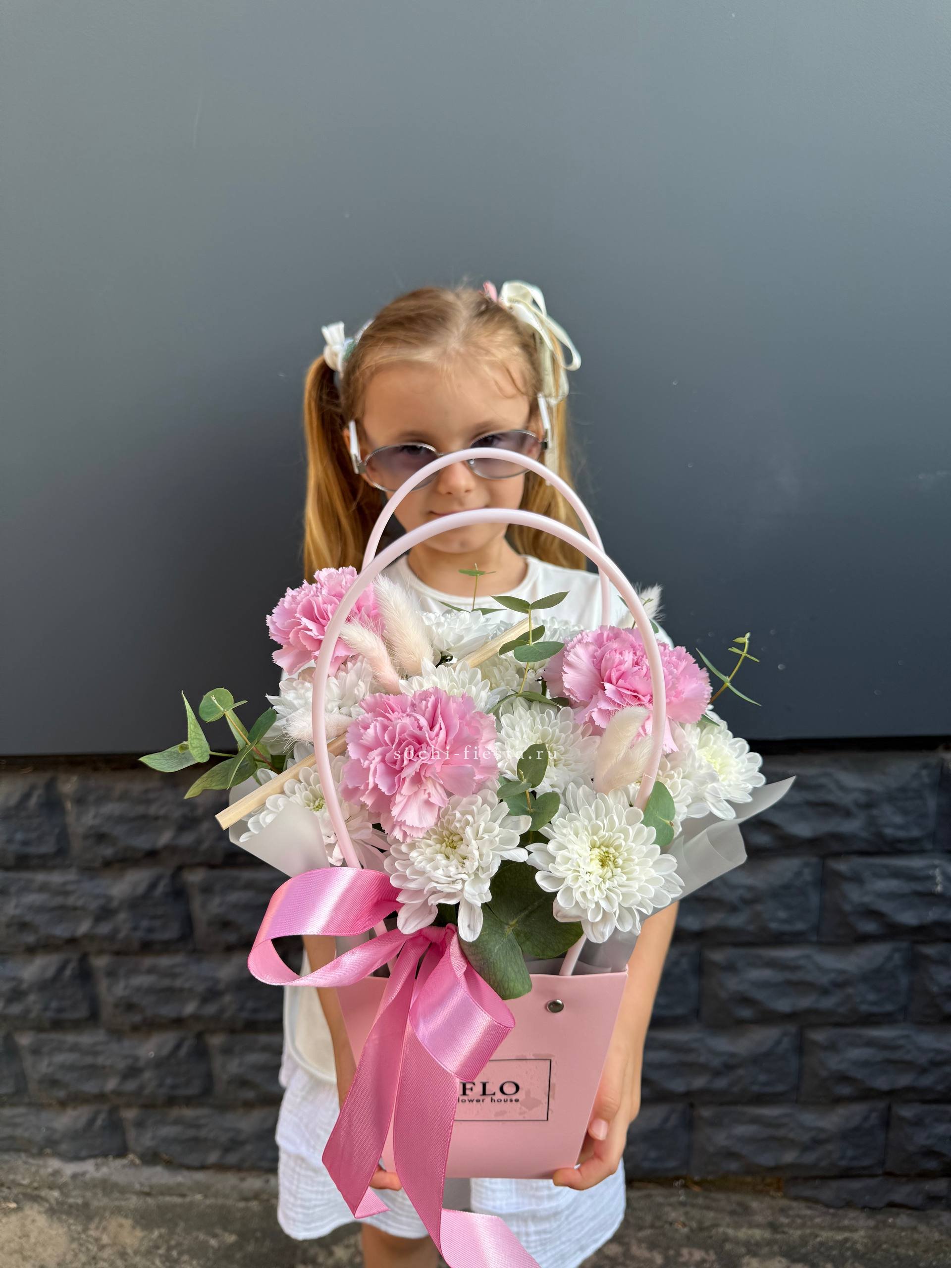 хризантемы, статица (аналог), маттиола, сумочка, оазис, оформление.