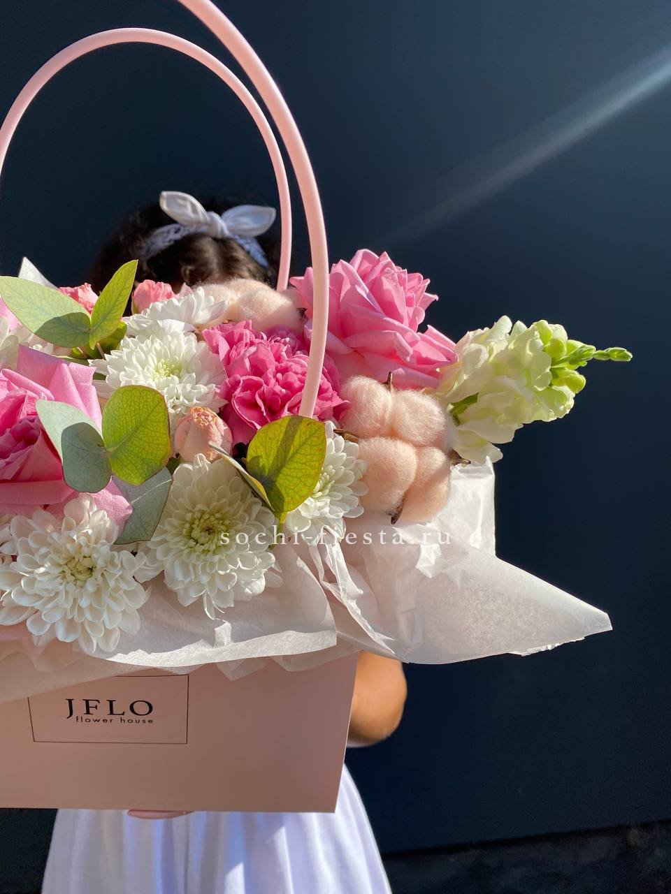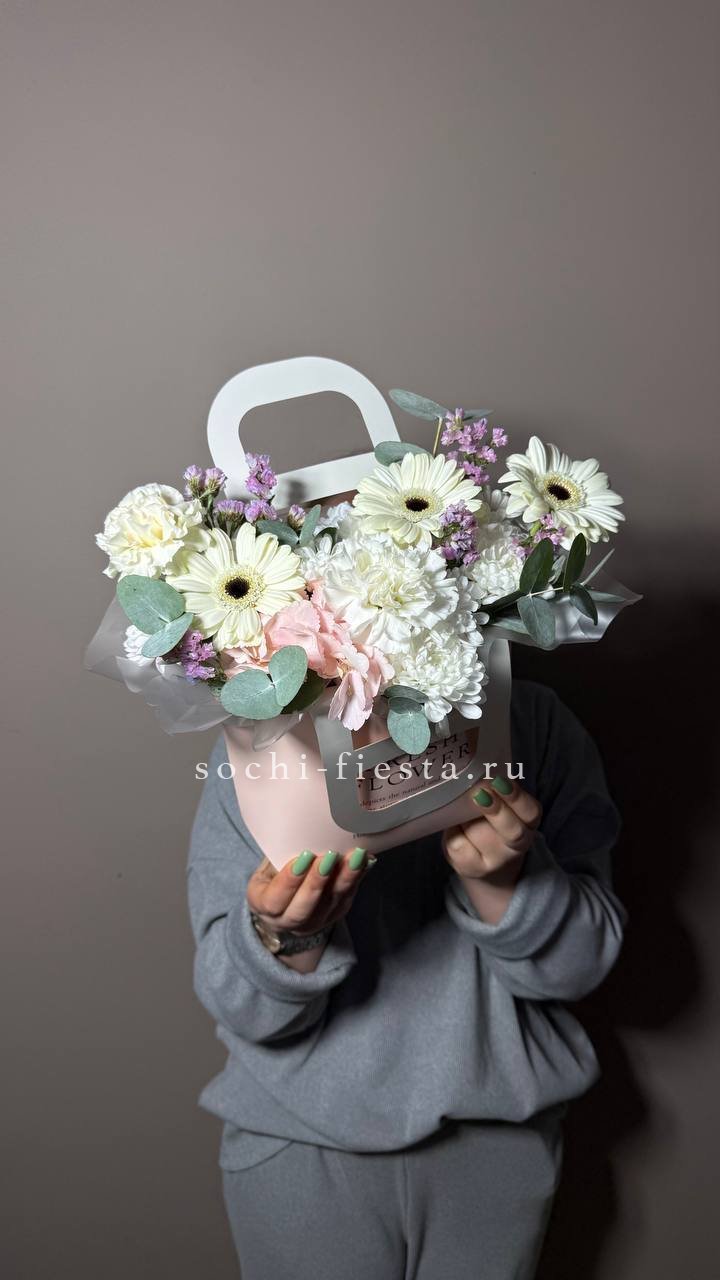 Воплощение изысканности и тренда! Эта стильная композиция в розовой сумочке объединяет в себе яркие цветовые акценты и современный флористический дизайн. Она идеально подойдет для модного образа или в качестве креативного подарка для ценителей необычных решений. Безупречный вкус в каждой детали.