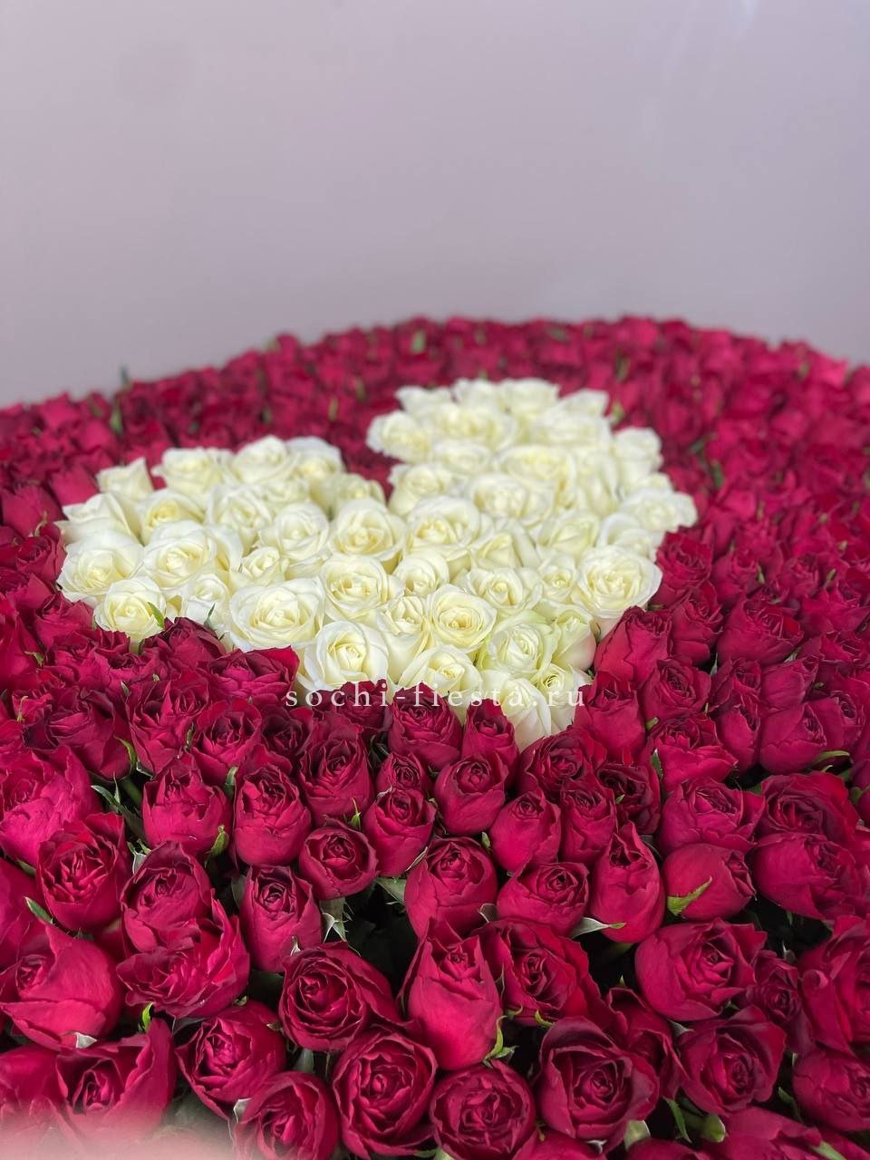 Пятьсот один бутон создает монументальную композицию в естественной корзине. Плотное заполнение формирует цельное полотно красного цвета, которое невозможно не заметить с первой секунды.