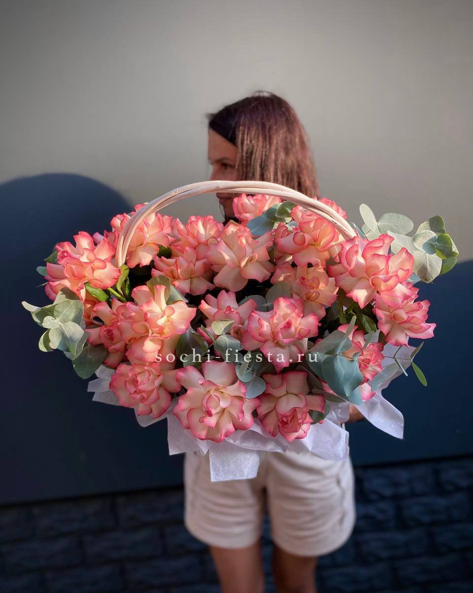 555 роз, зелень (папоротник или эвкалипт, в зависимости от сезона) оформление в корзину. Длина надписи не должна превышать 4 букв.