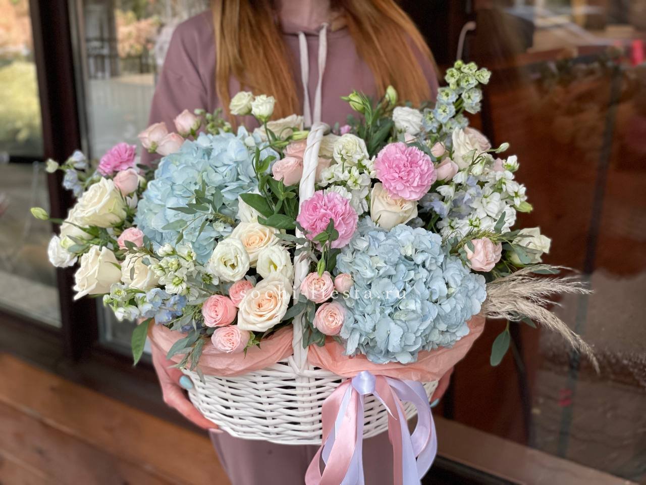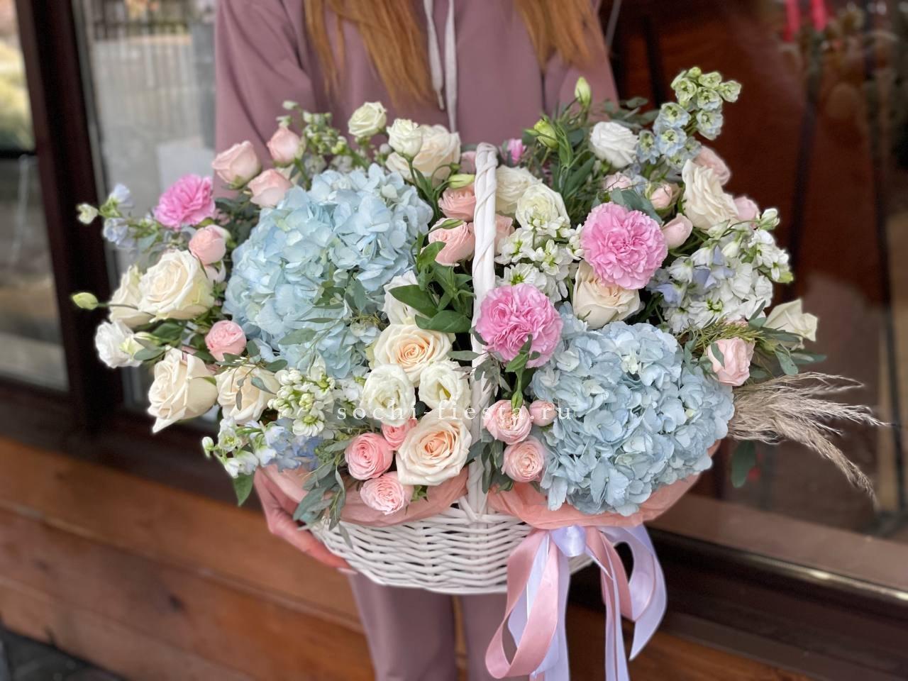 гортензия, эустома, розы, маттиола (дельфиниум или аналоги), кустовые розы, лента, корзина D40