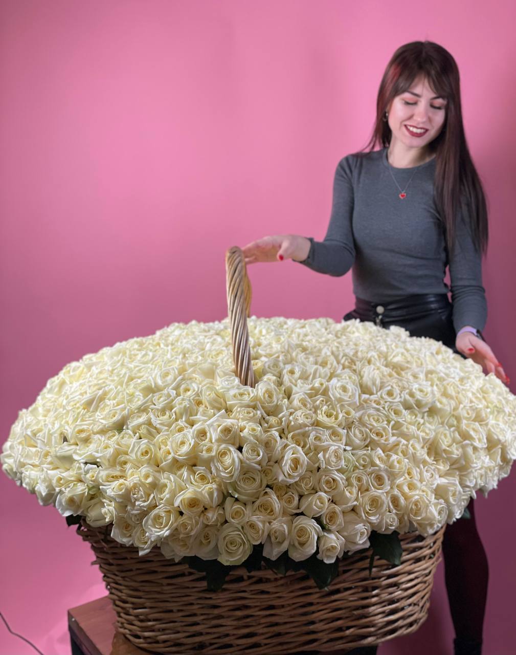 Пышная корзина объединяет пионовидные розы с воздушной гортензией и многослойной эустомой. Матиолла и лимониум добавляют глубину композиции, а диантус создает мягкие переходы между крупными бутонами.