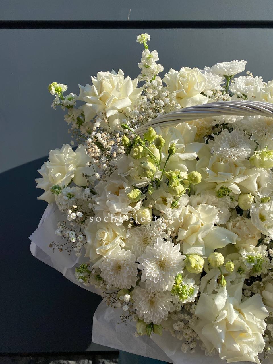 роза одноголовая, роза пионовидная, альстромерия, эустома, гортензия, ковыль, диантус, плетеная корзина.