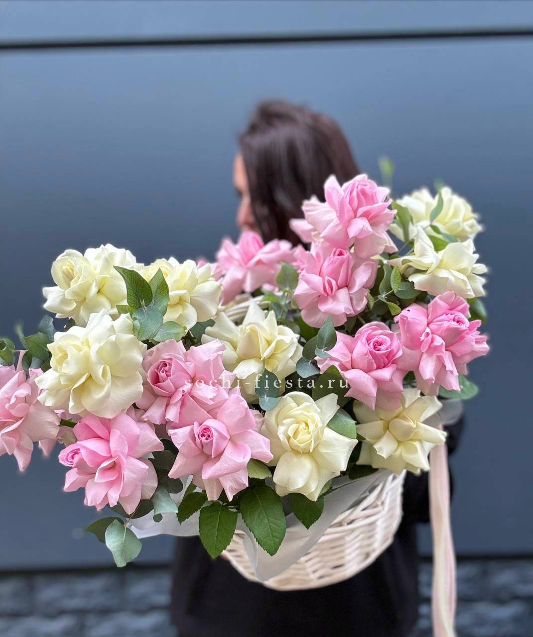 Плетёная корзина вмещает густую композицию из белых и розовых бутонов. Хризантемы и розы перемежаются с соцветиями гортензии, а статица добавляет воздушности между крупными головками цветов.