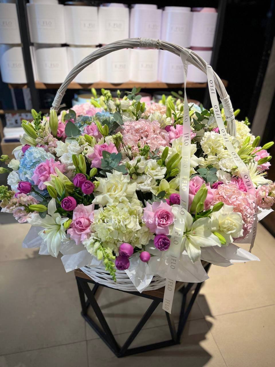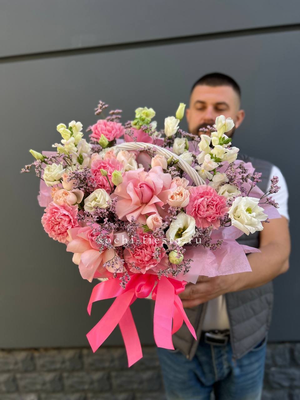 Здесь идеально сочетаются крупные, бархатистые бутоны роз, облака гортензии и мелкие акцентные цветы. Получилась невероятно воздушная и легкая композиция, которая мгновенно создает ощущение праздника и весеннего настроения. Стильный бант завершает этот изысканный образ.