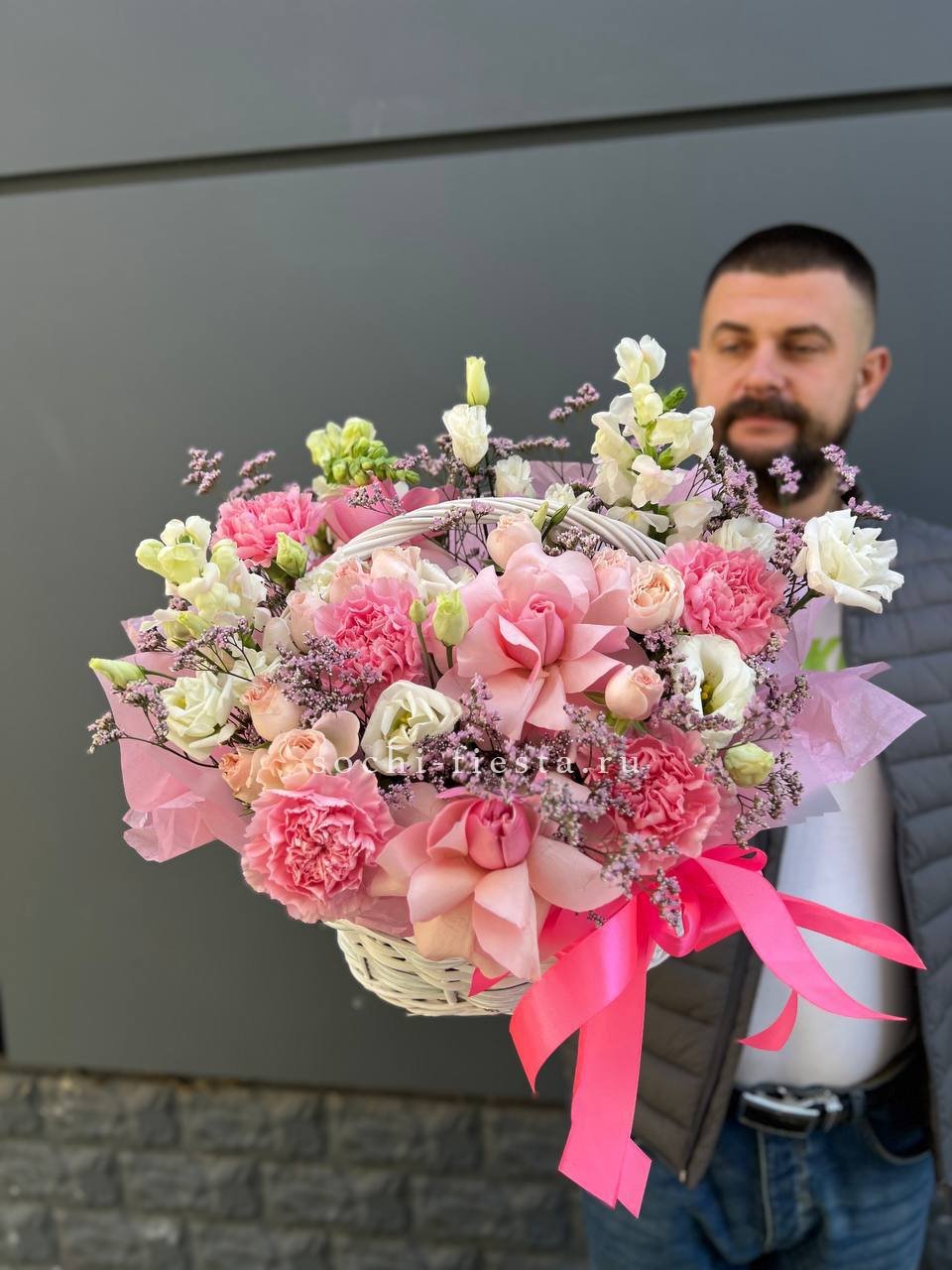 герберы, рзовая роза, диантус, озотамус, мисти баблс, бомбастиу, корзина малая.