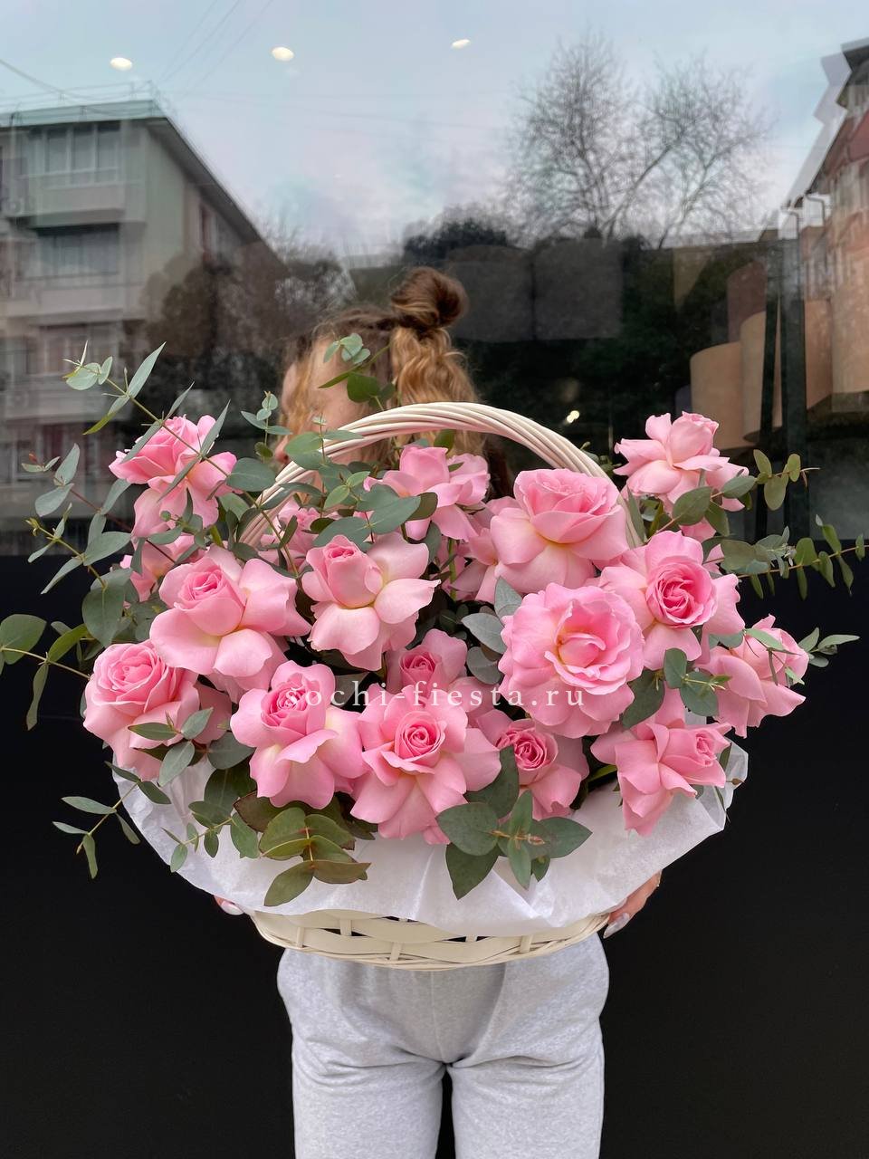 Пышные пионовидные розы Мисти Баблс и бомбастик создают объёмное облако в естественной плетёной корзине. Диантусы и статица добавляют воздушности, а эвкалипт завершает композицию свежими нотами. Яркое присутствие в любом пространстве.