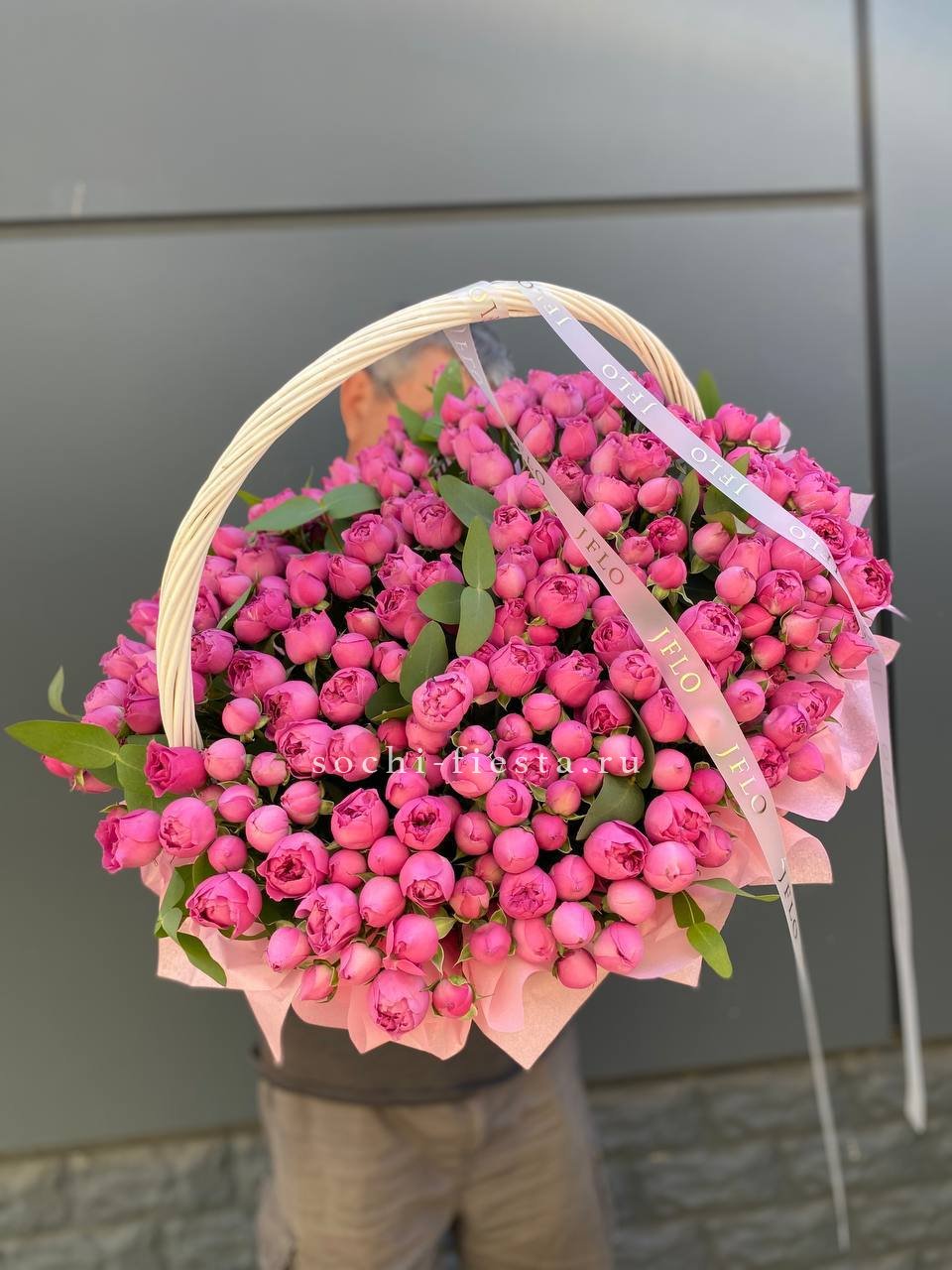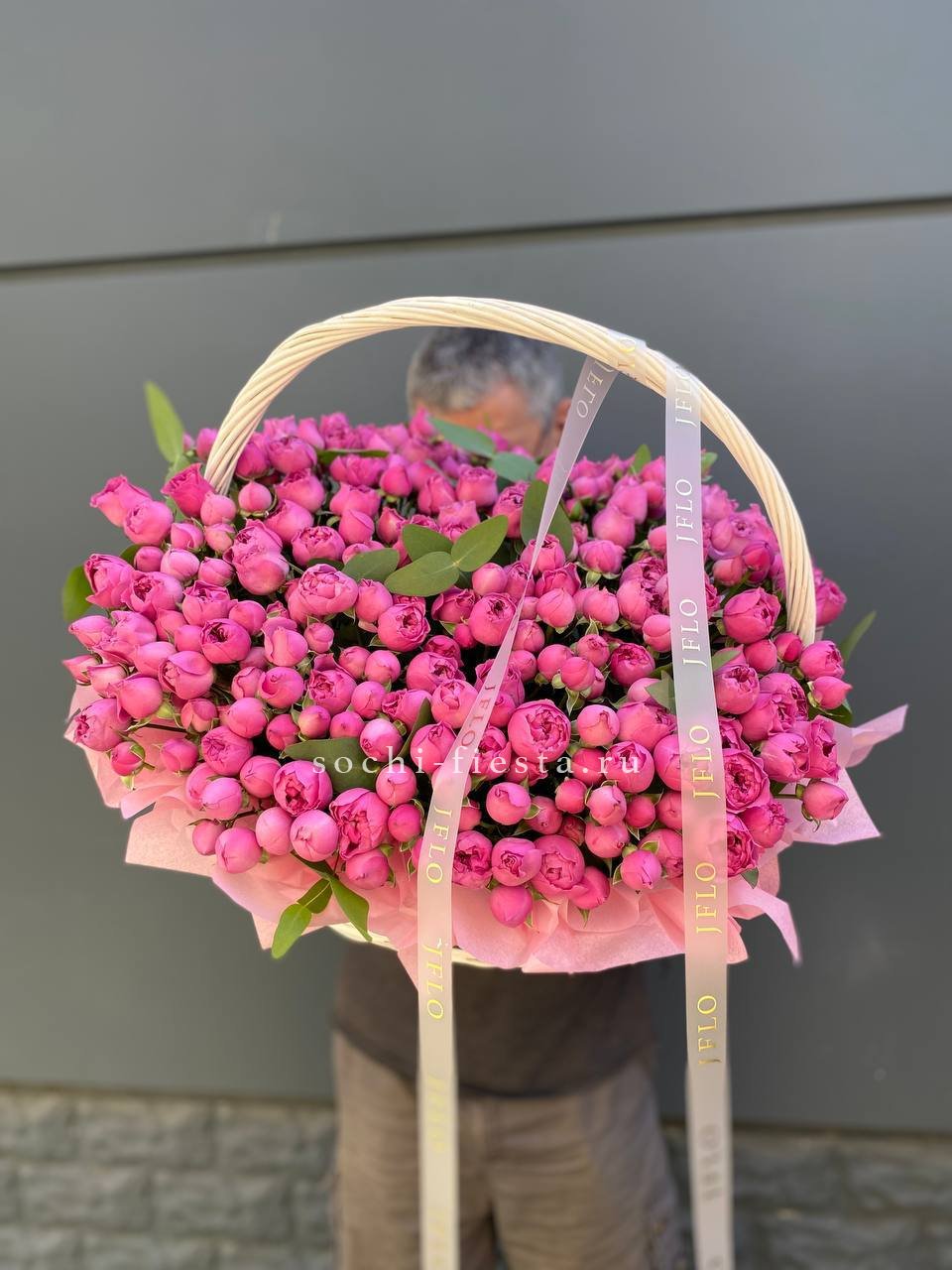 диантус, роза кустовая, гипсофила, гортензия, дельфиниум/львиный зев/маттиола (замена вне сезона), белая роза, георгины или аналог, эвкалипт, оазис, корзина D 25, двойной бант Состав композиции может быть незначительно изменен флористом в процессе изготовления с соблюдением стилистики, фактуры и цветовой гаммы оригинала.