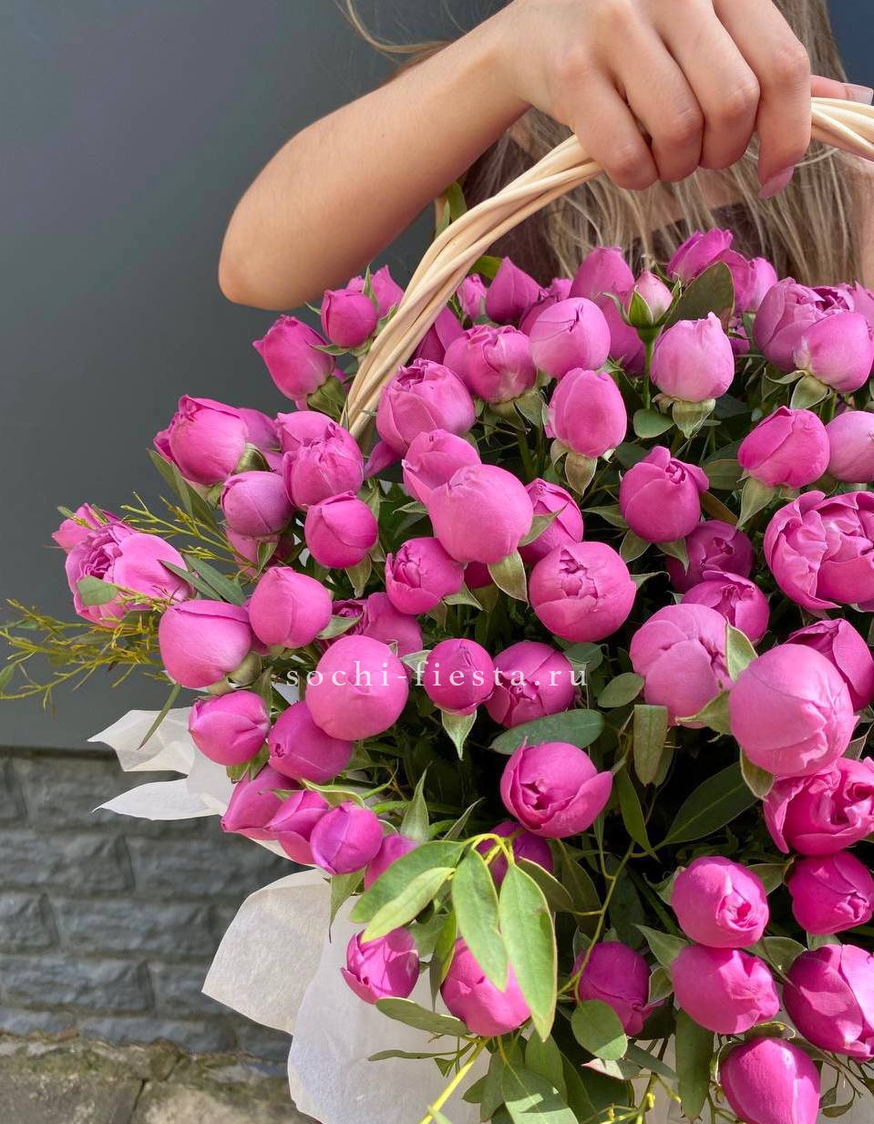 Пятьдесят один бутон Мисти Баблс собраны в плетёную корзину и образуют плотную цветущую полусферу. Лавандовые оттенки раскрываются постепенно и держат форму долго.