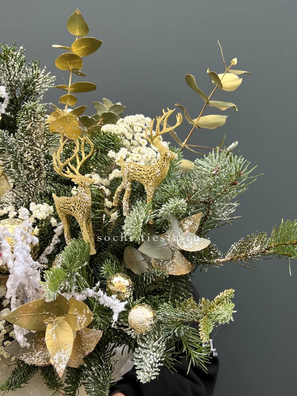 датский нобилис и ель образуют основу праздничной композиции в кашпо. Свеча и ёлочные игрушки дополняют образ, создавая готовое решение для новогоднего интерьера.