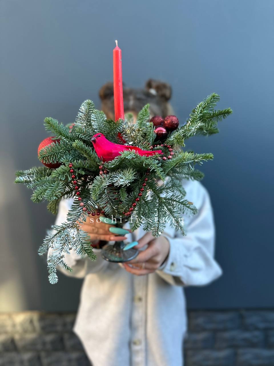 Свечи погружены в зелень нобилиса и окружены праздничными шарами. Композиция собрана в стеклянном бокале на флористическом оазисе. Завершённая форма для стола или камина.