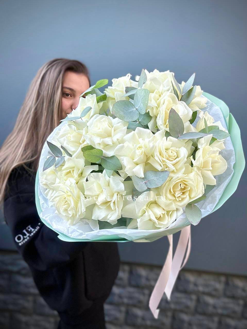 Белоснежные розы Бомбастик с густыми многолепестковыми бутонами собраны в свободную охапку. Каждый цветок раскрывается постепенно, создавая объёмную фактурную композицию.