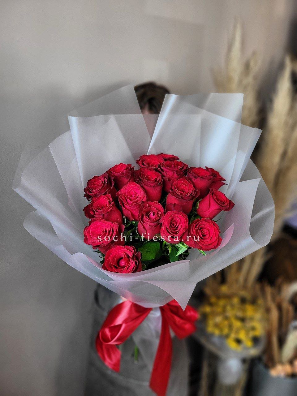 Бутоны Бомбастик распускаются крупными розетками и держат форму долго. Пятнадцать кустовых роз в крафте сохраняют свежесть и аккуратный силуэт.