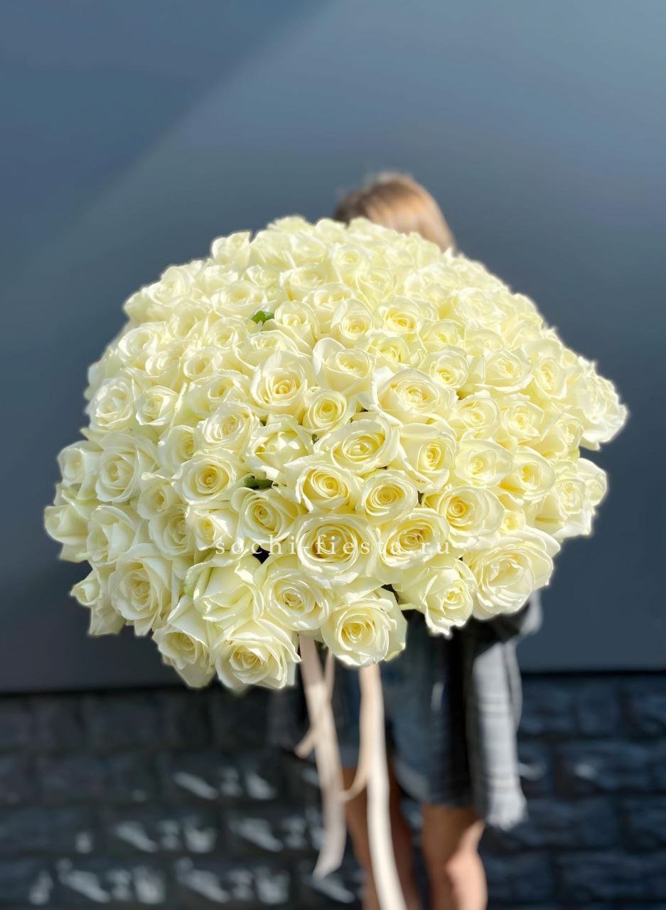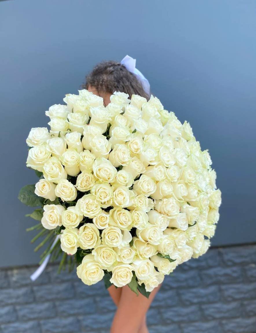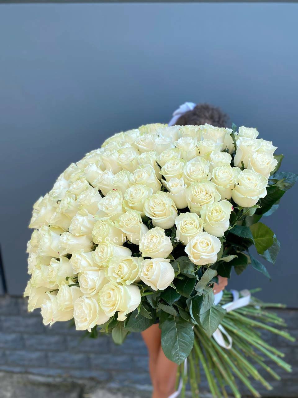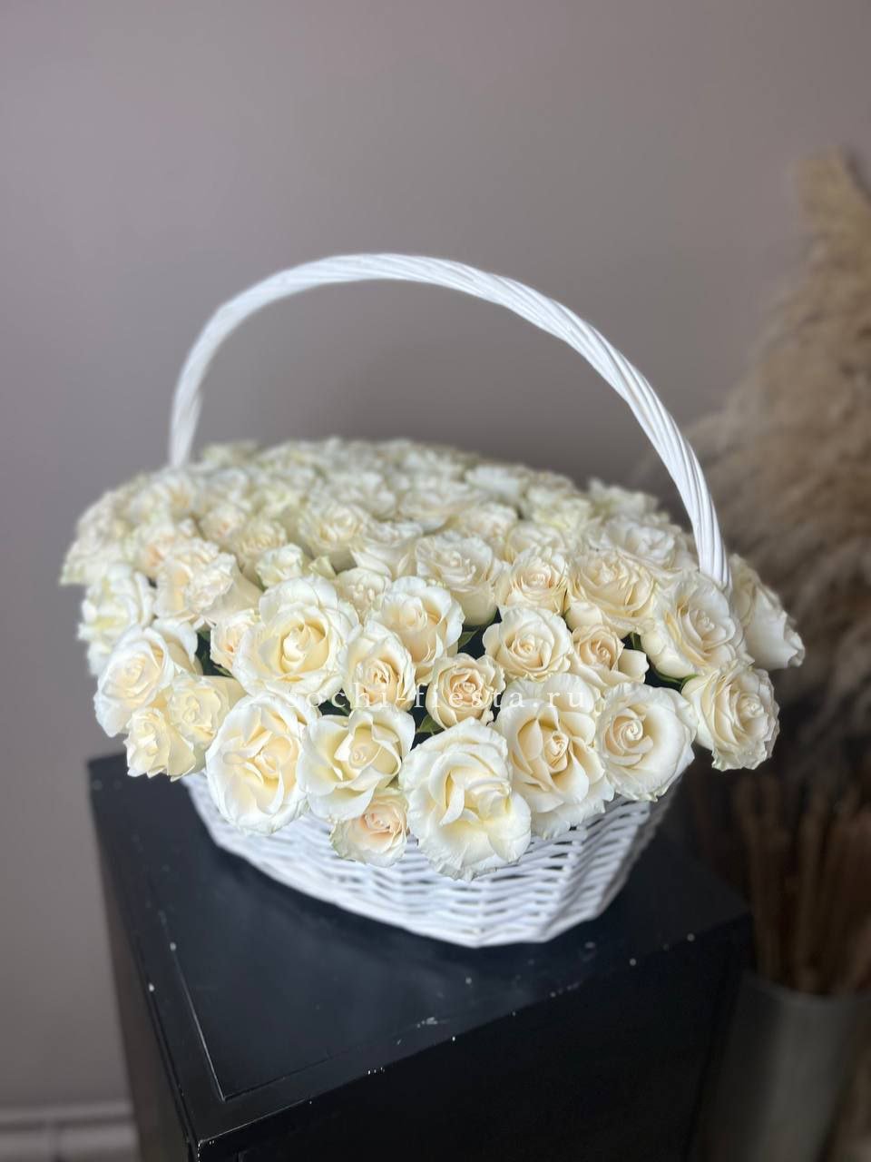 Сто одна роза белого цвета собрана в плетеную корзину и создает впечатление снежного сугроба. Такая композиция занимает пространство уверенно и притягивает взгляд своей безупречной чистотой.