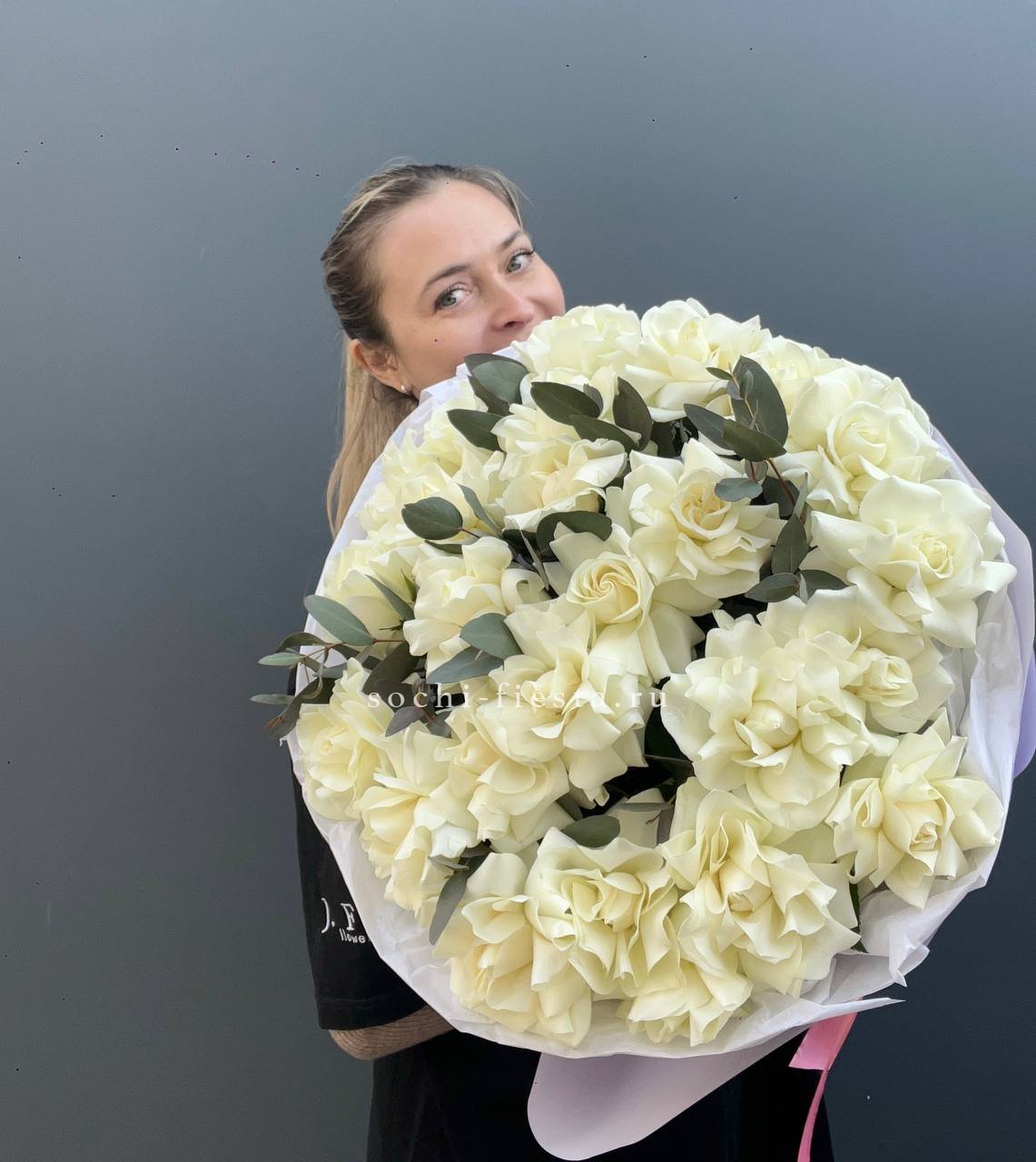 Двадцать пять вывернутых бутонов формируют объемную композицию с выразительным присутствием. Белые лепестки и зелень эвкалипта создают ощущение простора и легкости.